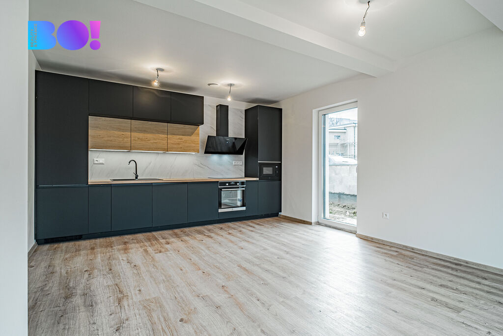 Obývací pokoj s kuchyňským koutem a přímým vstupem na terasu a zahradu.