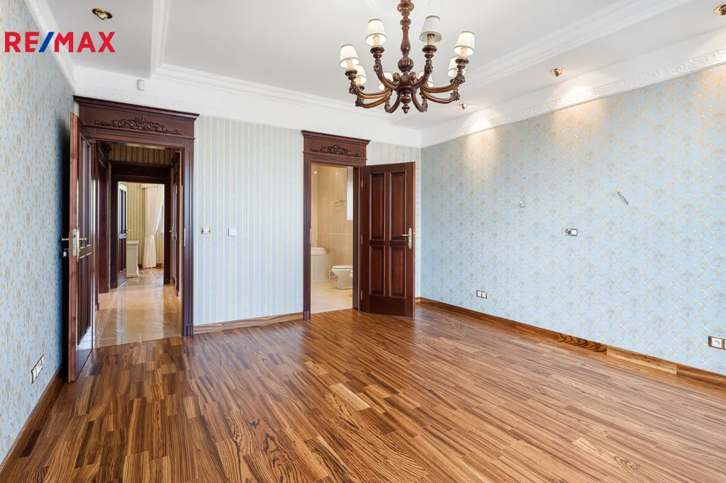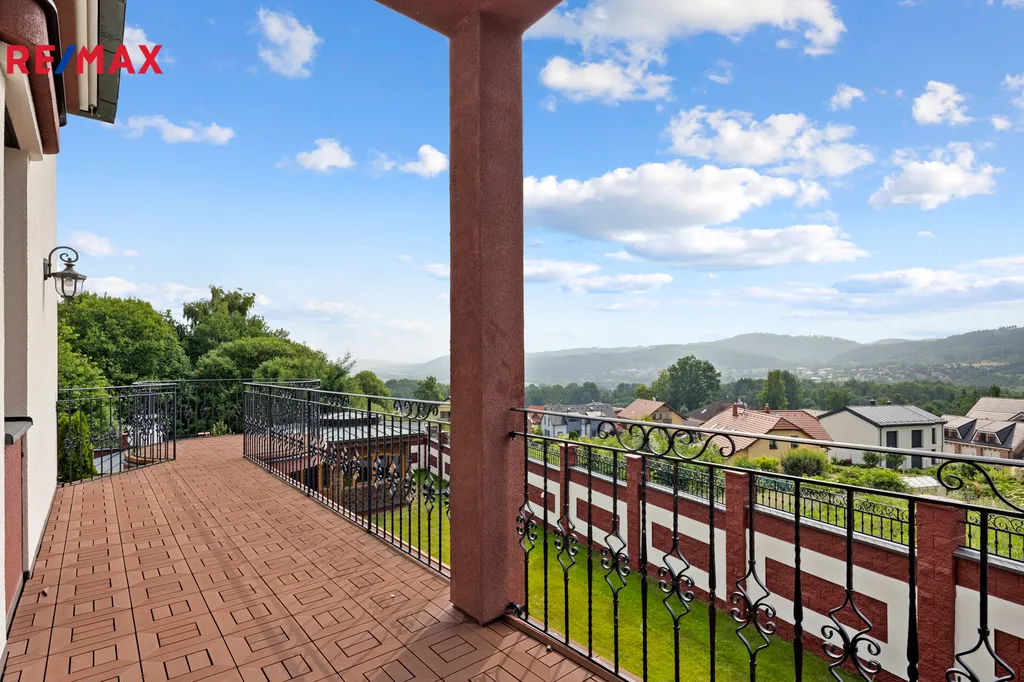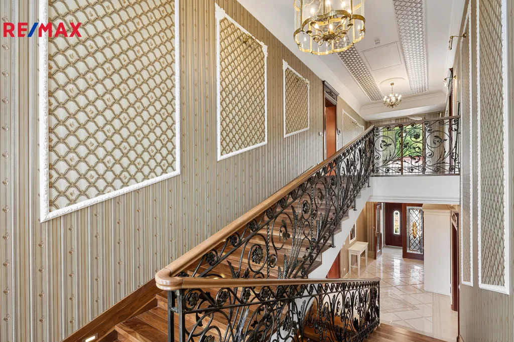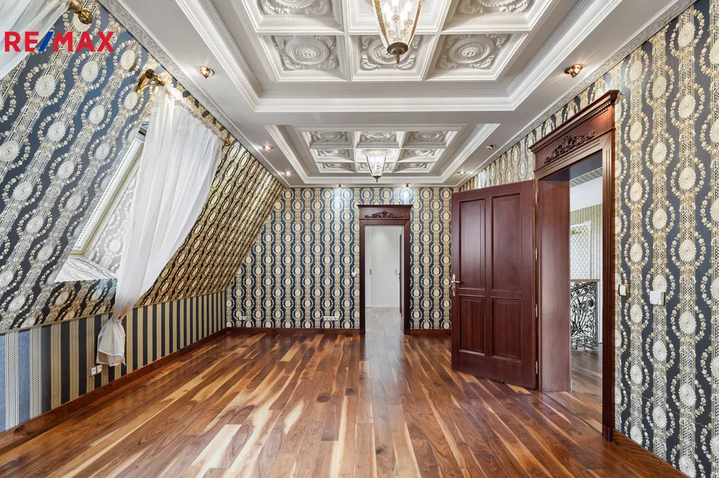 V patře se nachází další elegantní ložnice s balkonem a vlastní koupelnou, pracovna a prostorná šatna – vše s důrazem na komfort a vkus.