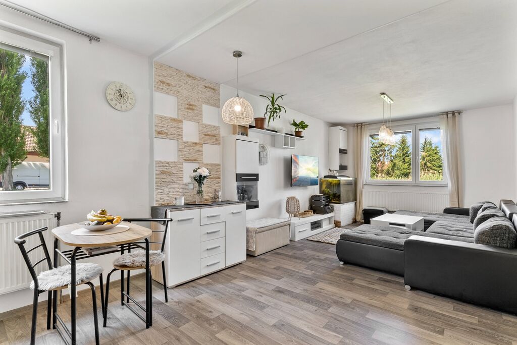 volnočasových aktivit. Rodinný dům o podlahové ploše 181 m² nabízí dvě samostatné bytové jednotky, každou s vlastním vstupem, což zajišťuje maximální soukromí i pohodlí pro vícečlennou rodinu nebo dvě generace. Dům prošel částečnou rekonstrukcí –byly vyměněny stropy, podlahy, koupelna, kuchyně, rozvody elektřiny a nově bylo instalováno tepelné čerpadlo značky NIBE (voda–vzduch), které zajišťuje moderní a efektivní vytápění. K dispozici je také vlastní studna, přípojka na obecní vodovod, bojler pro ohřev vody a napojení na kanalizaci. Velkou výhodou je strategická poloha obce – díky blízkému nájezdu na dálniciD11 je Praha (Černý Most) dostupná autem přibližně za 20 minut. Parkování je možné přímo před domem na veřejném stání. Tento dům představuje ideální příležitost pro ty, kteří hledají klidné bydlení na venkově v kombinaci s rychlou dostupností do města, a zároveň chtějí mít prostor pro vlastní rodinu nebo pro více generací pod jednou střechou.