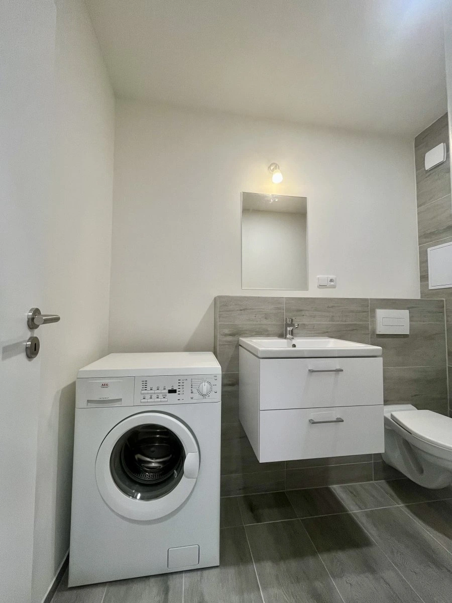 Koupelna se sprchovým koutem, toaletou a pračkou.