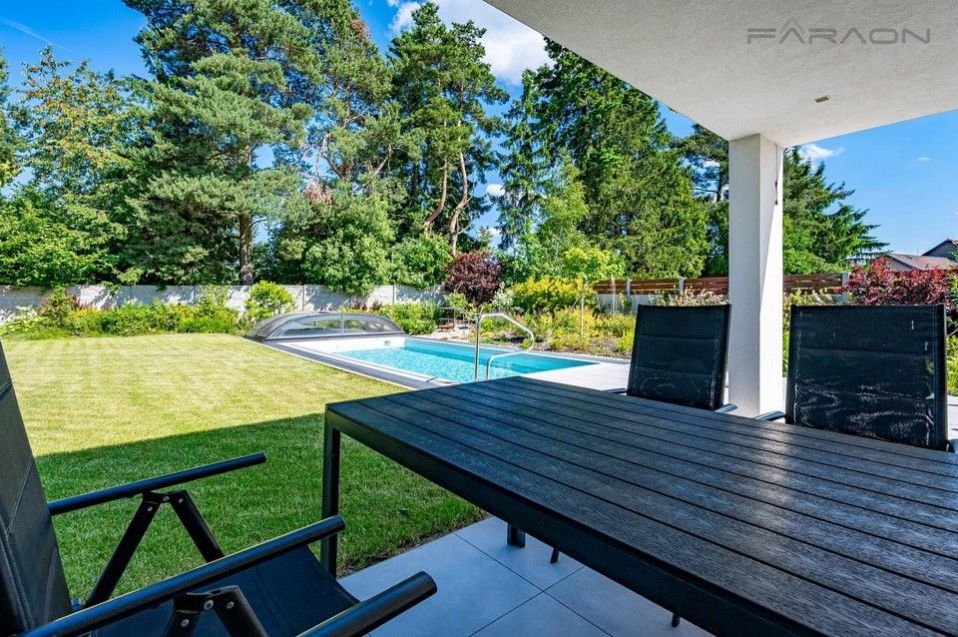 Prodej moderní pasivní a vzdušné novostavby (A) z roku 2021 vytápěné tepelným čerpadlem, včetně vyhřívání zastřešeného bazénu (7,2 x 3,4 m) se slanou vodou a protiproudem, splňuje veškeré nároky na bydlení vyššího standardu v přírodě s nízkými provozními náklady, a to v luxusním jednopodlažním domě s rekuperací vzduchu. Dům nabízí vzdušný a slunný interiér na krásném, rovinatém a slunném pozemku o velikosti 1 132 m v klidné rezidenční části obce Mukařov Srbín nedaleko Říčan, pouhých 20 km od Prahy. Pozemek zahrnuje upravenou zahradu s automatickým zavlažováním. Pozemek zahrnuje upravenou zahradu s automatickým zavlažováním a designový zahradní domek se sociálním zařízením (koupelna, toaleta), samostatným pokojem a technickou místností (sklad), vše lemováno vzrostlou zelení, zděným plotem a hliníkovými lamelami, které zajišťují maximální nerušené soukromí a zároveň pocit intimity a ničím nerušeného klidu.