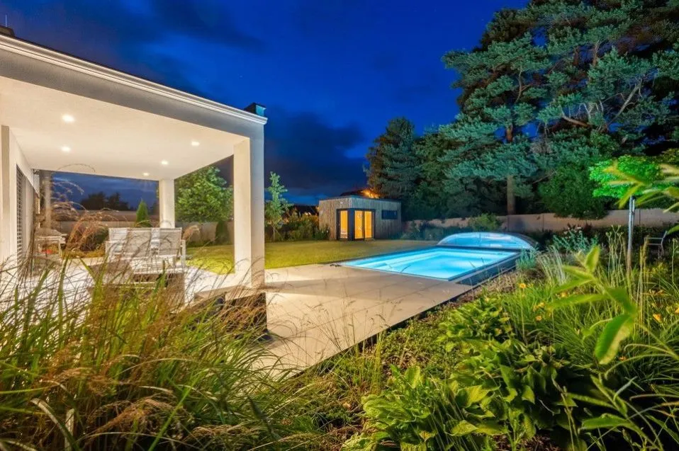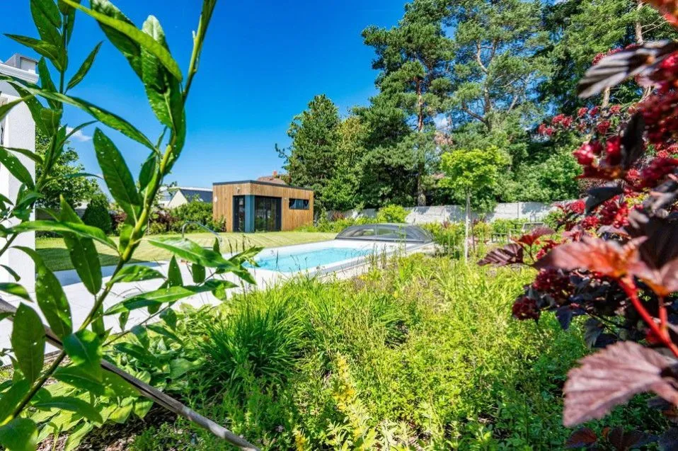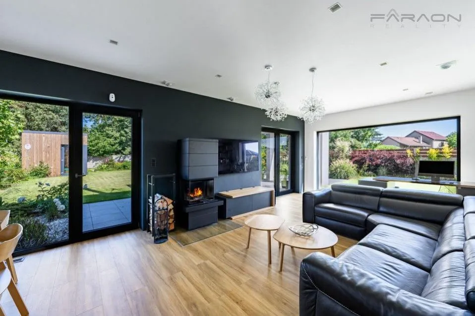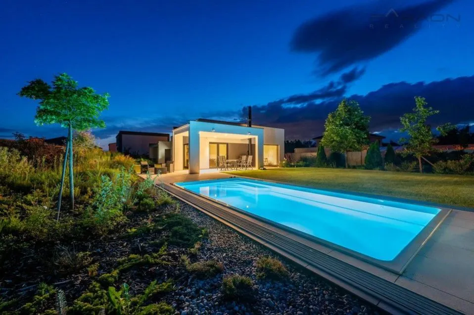 Prodej moderní, pasivní a vzdušné novostavby (A) 3kk obklopené krásnou, udržovanou zahradou s bazénem, vytápěné tepelným čerpadlem, včetně vyhřívání zastřešeného bazénu (7,2 x 3,4 m) se slanou vodou a protiproudem, splňuje veškeré nároky na bydlení vyššího standardu v přírodě s nízkými provozními náklady, a to v luxusním jednopodlažním domě s rekuperací vzduchu. Dům nabízí vzdušný a slunný interiér na krásném, rovinatém a slunném pozemku o velikosti 1 132 m v klidné rezidenční části obce Mukařov Srbín nedaleko Říčan, pouhých 20 km od Prahy. Pozemek zahrnuje upravenou zahradu s automatickým zavlažováním. Pozemek zahrnuje upravenou zahradu s automatickým zavlažováním a designový zahradní domek se sociálním zařízením (koupelna, toaleta), samostatným pokojem a technickou místností (sklad), vše lemováno vzrostlou zelení, zděným plotem a hliníkovými lamelami, které zajišťují maximální nerušené soukromí a zároveň pocit intimity a ničím nerušeného klidu.
