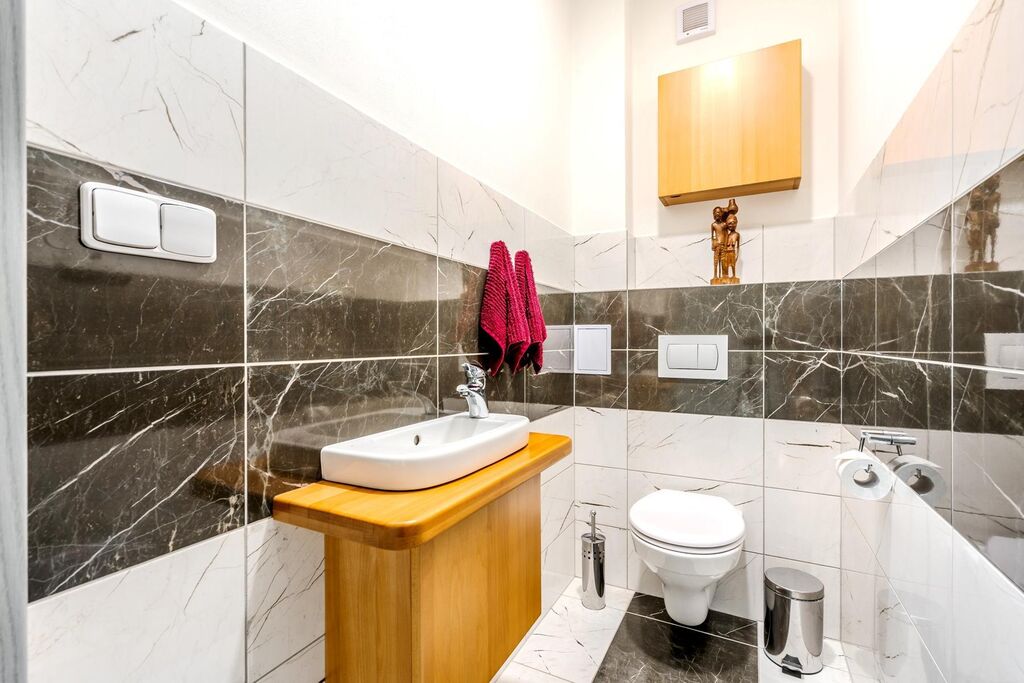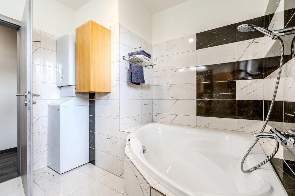 Kuchyňská linka značky EGGER zhotovená na míru je vybavena spotřebiči značky BOSCH – indukce, mikrovlnná trouba, digestoř, trouba, pračka, myčka, lednice. Veškerá okna s ventilací jsou kryta sítí proti hmyzu a to včetně dveří na terasu. Velmi příjemná je orientace oken na sever /jih/východ, kdy je v celém bytě opravdu hodně světla. Kromě dlažby je ve zbytku interiéru vinylová podlaha zn. EGGER a v zimních měsících určitě oceníte podlahové vytápění v celém přízemí a horní koupelně. V ložnicích jsou pak deskové radiátory. Vytápění a ohřev vody je řešen elektrokotlem značky Protherm a požadovanou teplotu v prostoru lze nastavit na nástěnném termostatu.