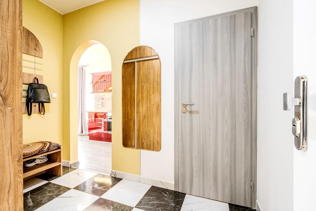 Byt o dispozici 3kk a s užitnou plochou 78 m2 se nachází v rodinném domě se třemi bytovými jednotkami. K bytu náleží zahrada o velikosti 235 m2 s přístupem do ulice a dvě parkovací stání před domem, u kterých je vybudován vjezd na zahradu. V přízemí se krom vstupní chodby (6 m2) a toalety (1,8 m2) s umyvadlem a závěsným WC nachází prosvětlený obývací pokoj (23 m2) s kuchyňským koutem a francouzskými dveřmi se vstupem na terasu/zahradu. V patře jsou dvě samostatné ložnice (12 m2 a 16,5 m2) a rozšířená koupelna (6,5 m2) se závěsným WC. Veškerý nábytek byl zhotoven na míru. WC, koupelna, postel, schodiště i vstup na půdu je vyroben z bukového masivu.