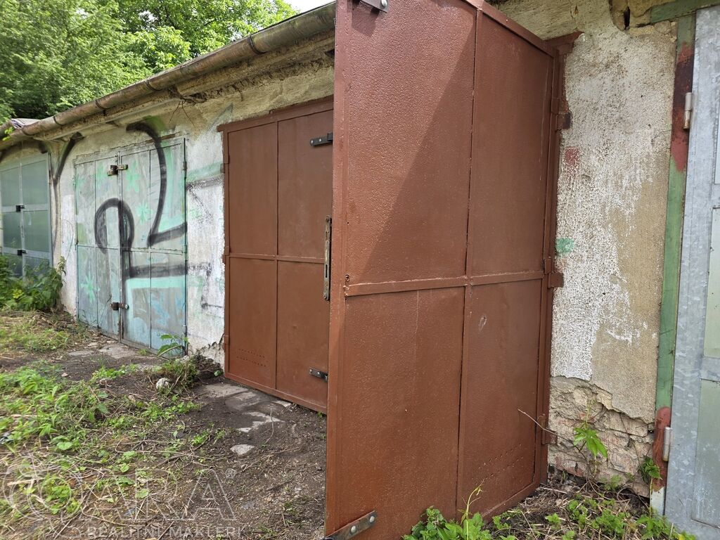 Šířka vrat 240cm i výška vrat 186cm jsou standardních rozměrů a umožňují pohodlný vjezd i novým, stále se zvětšujícím automobilům. Vnitřní rozměry jsou následující- 290cm je šířka garáže a 572cm je délka od zadní stěny po vrata. Výška 209cm v nejnižším bodě a 240cm v nejvyšším bodě v zadní části garáže. Garáž je bez elektřiny. Garáž je historicky propojena s vedlejší garáží a řešení je na domluvě.