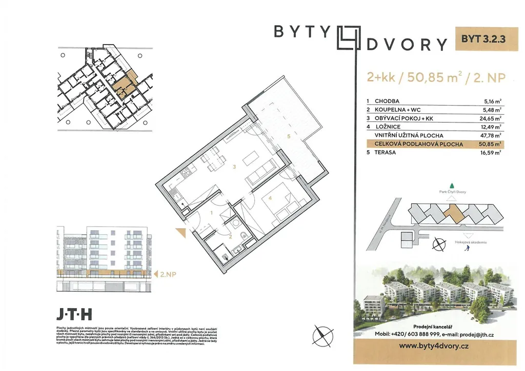 Nabízený byt v této inzerci je dispozice 2 + kk o výměře 50,85 m2 a jeho příslušenstvím je luxusní terasa 16,53 m2, která je unikátně propojena s venkovním prostorem plného zeleně. Byt č. 3.2.3 se nachází ve 2. NP šestipodlažního bytového domu s výtahem BYTY 4 DVORY, sekce 3. Předpokládaný termín dokončení stavby je prosinec 2025. Dispoziční řešení bytu: ze vstupní chodby (5,16 m2) je přístupná koupelna (5,48 m2). Vstupní chodba umožňuje umístnění vestavěných skříní. Z chodby je dále přístupný obytný prostor (24,65 m2) s prakticky řešeným kuchyňským koutem. Obytný prostor je krásně prosvětlen velkou okenní sestavou. Ložnice (12,49 m2) je přístupná z obytného prostoru. Na terasu (16,59 m2) je přímý vstup jak z obytného prostoru tak z ložnice. Celý byt je orientován na východ. Standardní vybavení bytu: kvalitní zařizovací předměty koupelny (sprchový kout, umyvadlo, toaleta, přípojka pro pračku), obklady, dlažby, vnitřní dveře a podlahové krytiny.