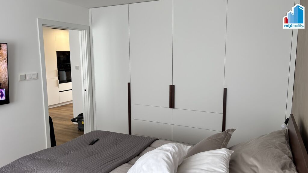 Dispozice bytu nabízí praktickou předsíň, elegantní a vkusně řešenou koupelnu, nádhernou kuchyň s kvalitními vestavěnými spotřebiči a nábytkem na míru, obývací pokoj a příjemnou ložnici.