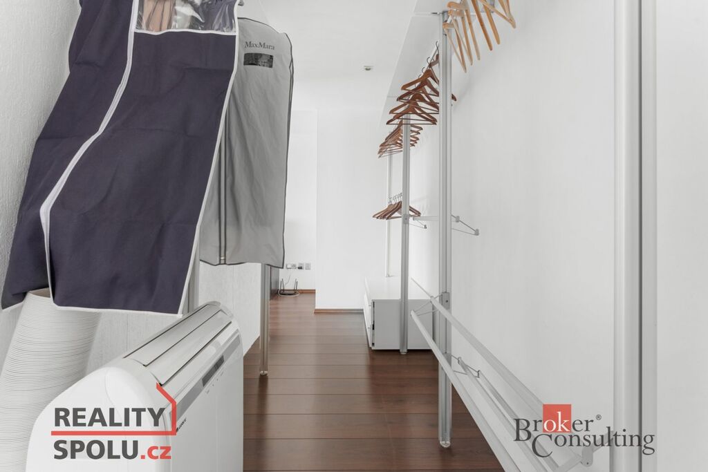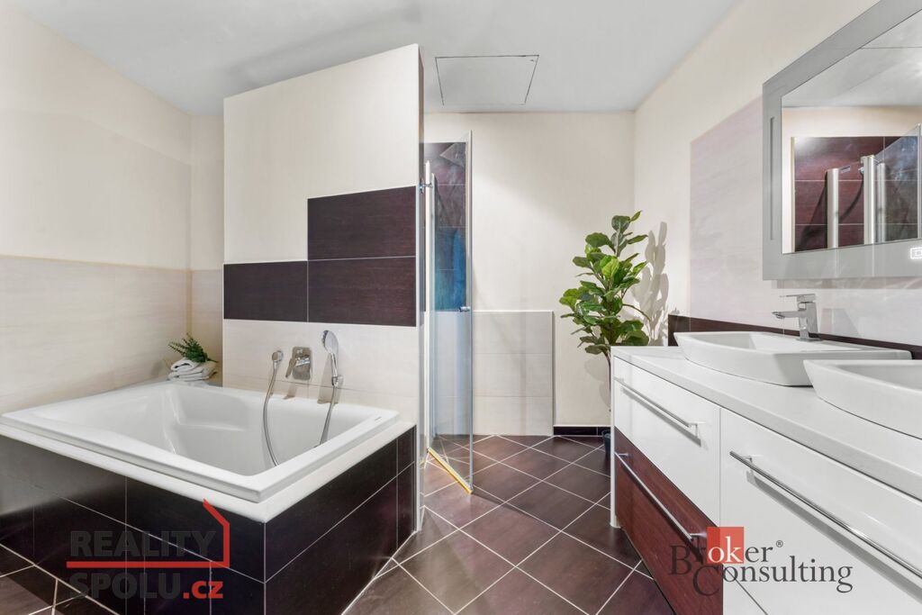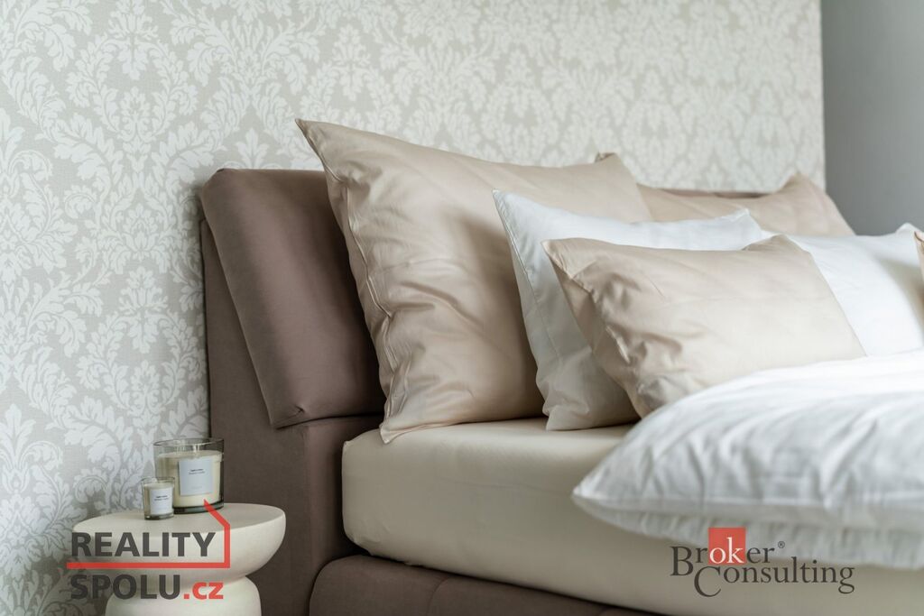 V patře se nachází ložnice (25,15 m²) s francouzským oknem, které nabízí výhled jak na terasu, tak na kouzelné západy slunce, k ložnici náleží také šatna (4,7 m²), o které sní každá žena. Dále jsou zde dva další pokoje (14,35 m² a 11,05 m²) vhodné jako dětské pokoje nebo pracovna, oba mají vstup na lodžii (3,55 m²). V patře nechybí ani koupelna s WC (4,95 m²) s vanou i sprchovým koutem, praktické úložné prostory na chodbě a elektrický krb, který dodává prostoru teplo a útulnost.