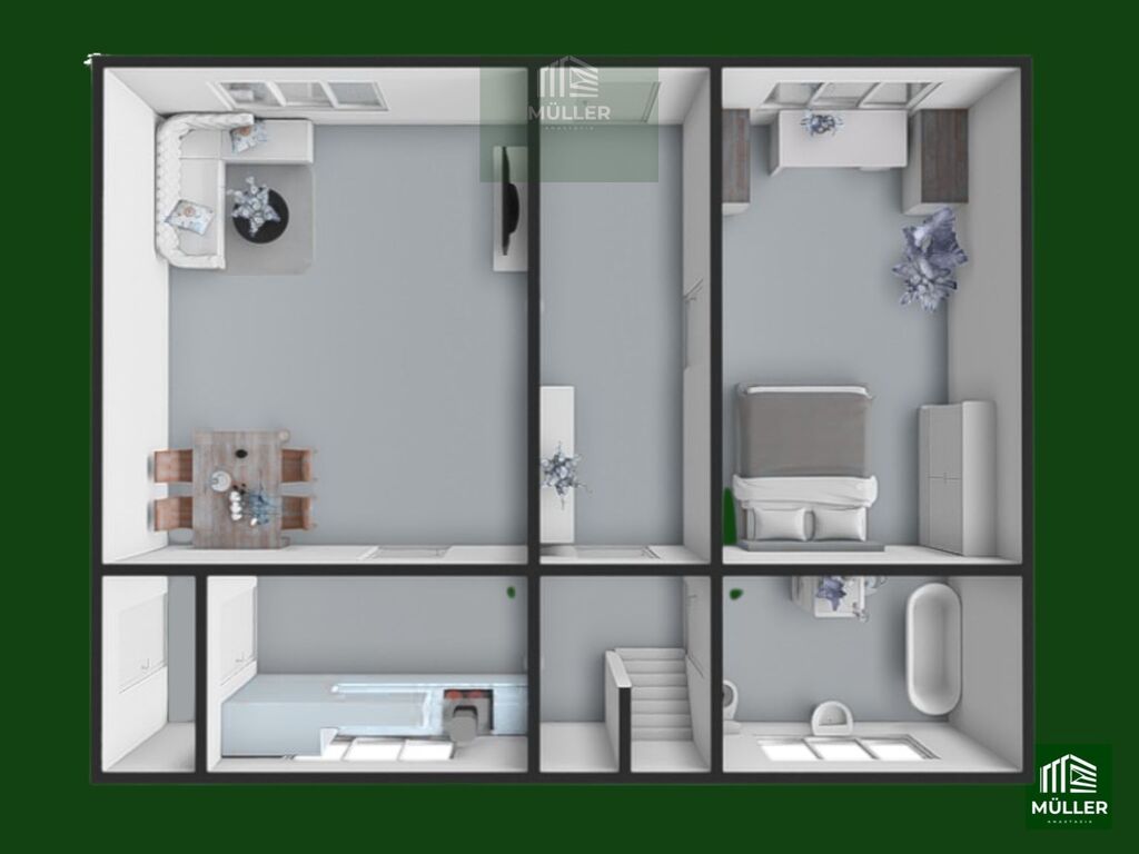 V přízemí se nachází několik obytných místností, koupelna a výstup na pozemek, kde je prostor pro vlastní zahrádku. Díky dispozici pozemku je možné vybudovat kryté stání pro auto přímo u domu.