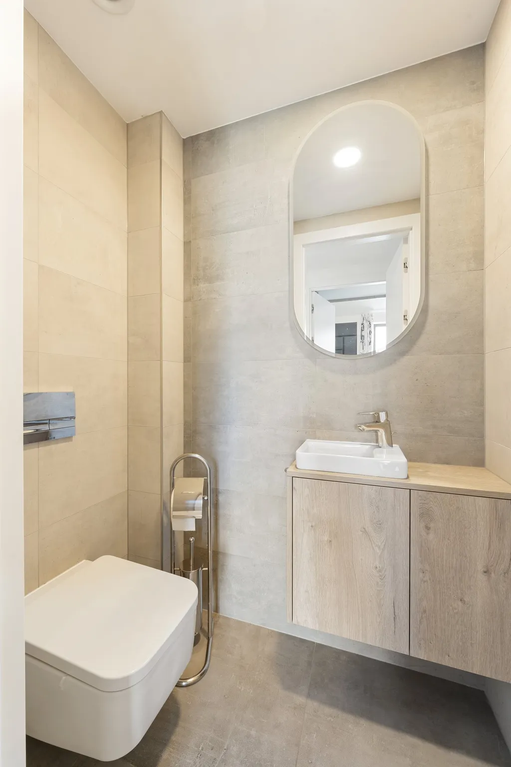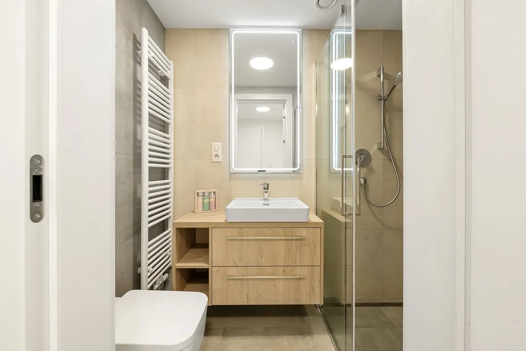 V patře najdete tři ložnice – hlavní ložnice má vlastní koupelnu se sprchovým koutem a toaletou a prostornou šatnu, dva dětské pokoje jsou vybaveny chytrými vestavnými patry, která šetří místo a přinášejí další hrací i úložný prostor. K dispozici je zde také druhá koupelna s vanou a samostatné WC.