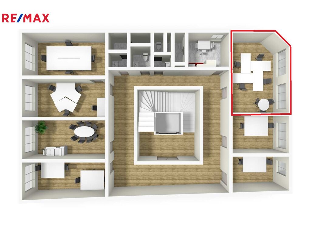 Současně nabízíme k pronájmu celkem 4 kanceláře ve 4. nadzemním podlaží. Naskýtá se proto možnost pronajmout současně několik nebo i všechny kanceláře současně. Nájemné za tuto kancelář je 2.830 Kč měsíčně bez DPH (DPH hradí pouze osoba/firma, která je plátcem DPH). Nájemník dále hradí energie a služby ve výši 2.944,- Kč měsíčně včetně DPH.