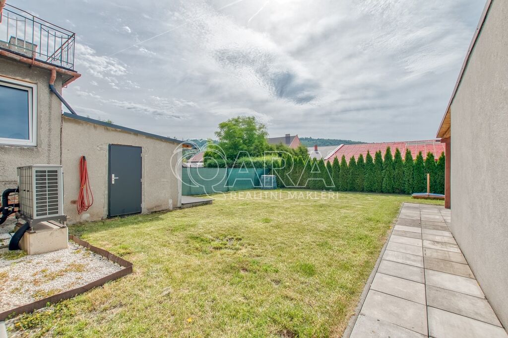Součástí domu je i garáž – po rekonstrukci, zateplená, s elektrickými vraty na dálkové ovládání a novou elektroinstalací. Na zahradě vás čeká letní kuchyňka s WC, útulná pergola a příjemné posezení ideální pro večery s přáteli. Vjezd je pohodlný, nechybí přístřešek pro další auto a vlastní brána.