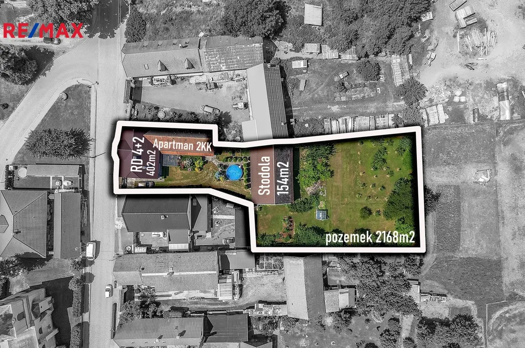 Celková výměra pozemku 2168m2 z toho je cca 400m2 zastavěno domem a stodolou. Zbývajících 1768m2 náleží k volnému pohybu po pozemku. Zahrada je zatravněna s kombinací stromů a keřů cca 60ks (ořech, višeň, jablka Golden, švestky, třešeň, broskve, jahody, rybíz, angrešt a vinná réva, možno využít skleníku o velikosti 6,3m2. Na velké zahradě je možnost zbudovat venkovní pergolu, pro Váš odpočinek a relaxaci v letních měsících. Bazén v přední části pozemku. Pozemek je po celém obvodu oplocený.