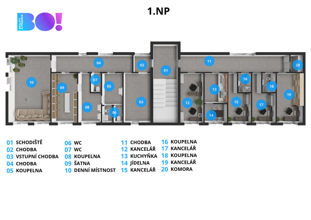 • Prostor pro Vaše nápady: Dvoupatrová cihlová budova nabízí 10 světlých kanceláří, 5 koupelen a 6 samostatných toalet – maximální komfort a pohodlí pro Vás i Váš tým.