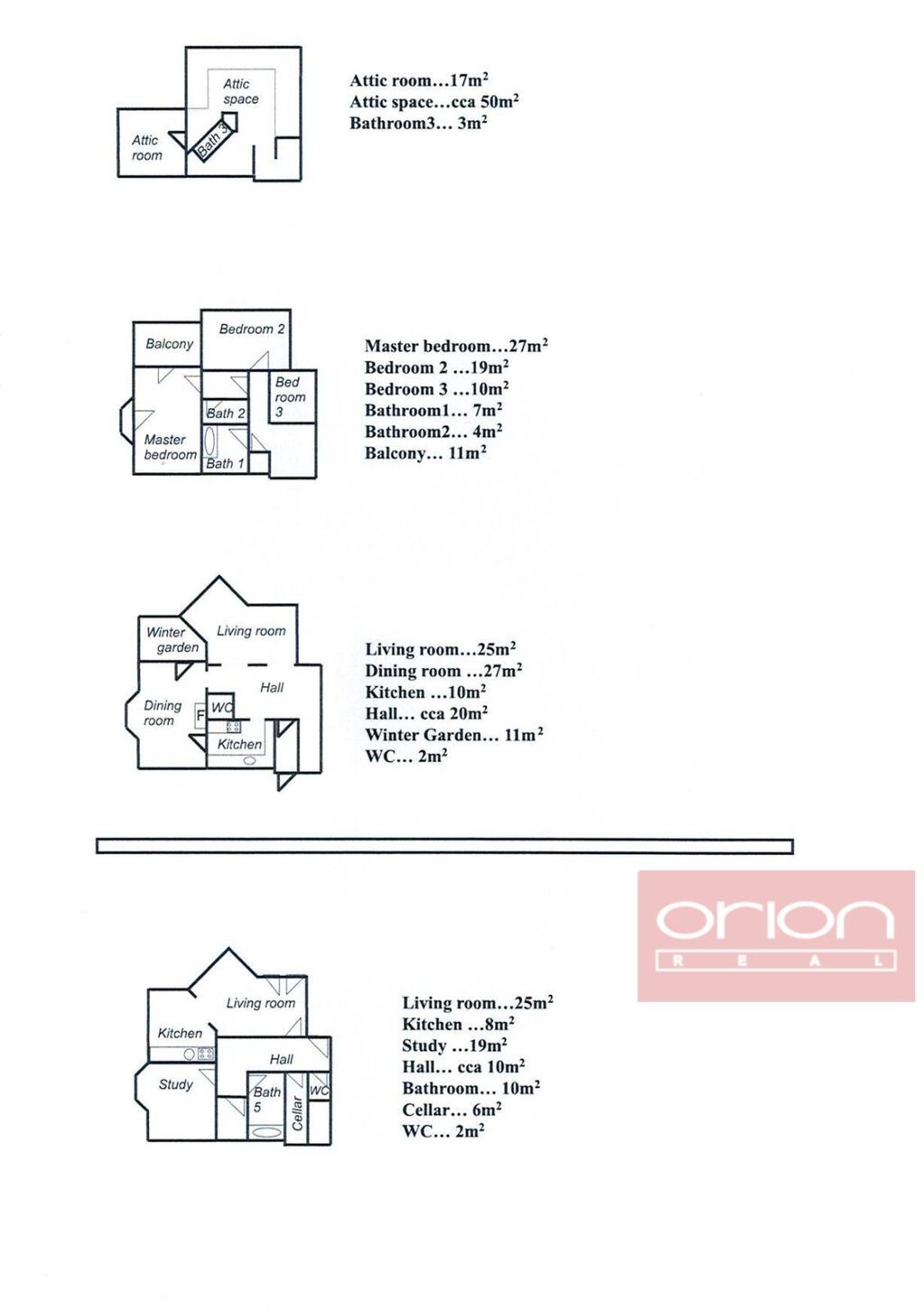 Přízemí: vstupní hala, samostatná kuchyň, jídelna s krbem, dva obývací pokoje, toaleta