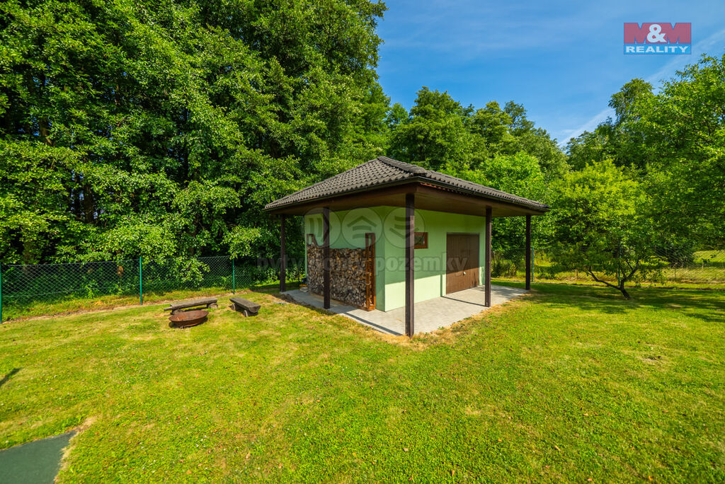 Prostorná zahrada nabízí klid k relaxaci u bazénu nebo dovádění s dětmi, dále je zde zahradní domek k uložení všeho potřebného.
