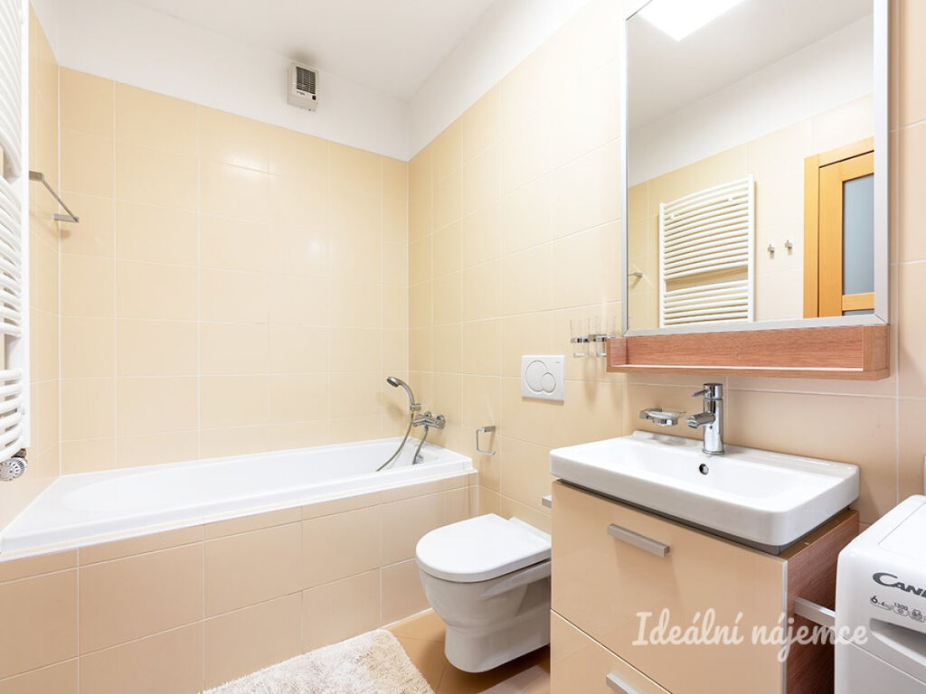 Byt se nabízí plně vybavený. Kuchyně disponuje lednicí s mrazákem, myčkou, elektrickou troubou, varnou deskou, mikrovlnnou troubou a digestoří. Obývací část je zařízena jídelním stolem se 4 židlemi, pohovkou, konferenčním stolem, komodou, skříňkami, obývací stěnou, TV a audio soustavou a klimatizací. Součástí ložnice je postel s matrací, noční stolky, držák TV, vestavěná skříň a stůl s židlí. V koupelně je vana, umyvadlo, koupelnová skříňka, zrcadlo, závěsné WC a pračka. V předsíni je vestavěná skříň.