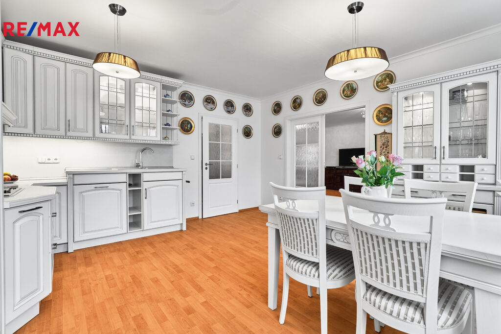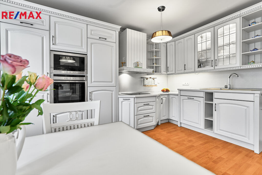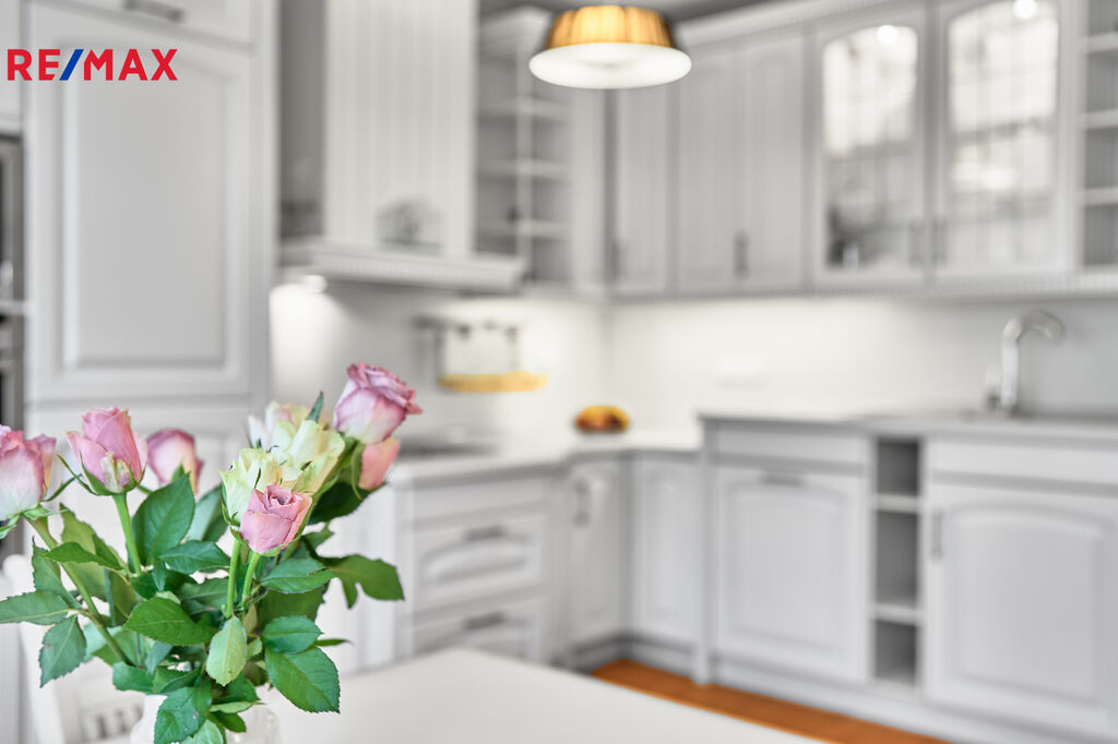 Kuchyň je propojena s obývacím pokojem, však má vlastní místnost, a vybavena světlým nábytkem ve stylu Provence.