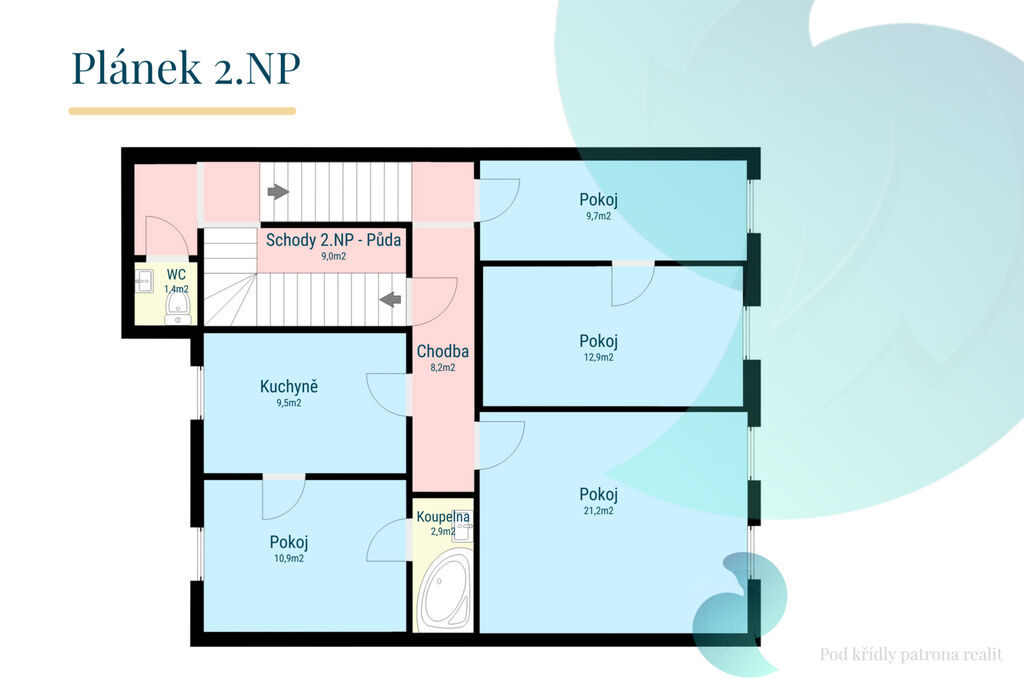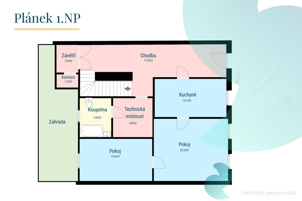 1.NP byt 4+1 (92 m2), který prošel rekonstrukcí zhruba před dvaceti lety. Disponuje kuchyní, prostorným obývacím pokojem, ložnicí, dvěma menšími pokoji a koupelnou.