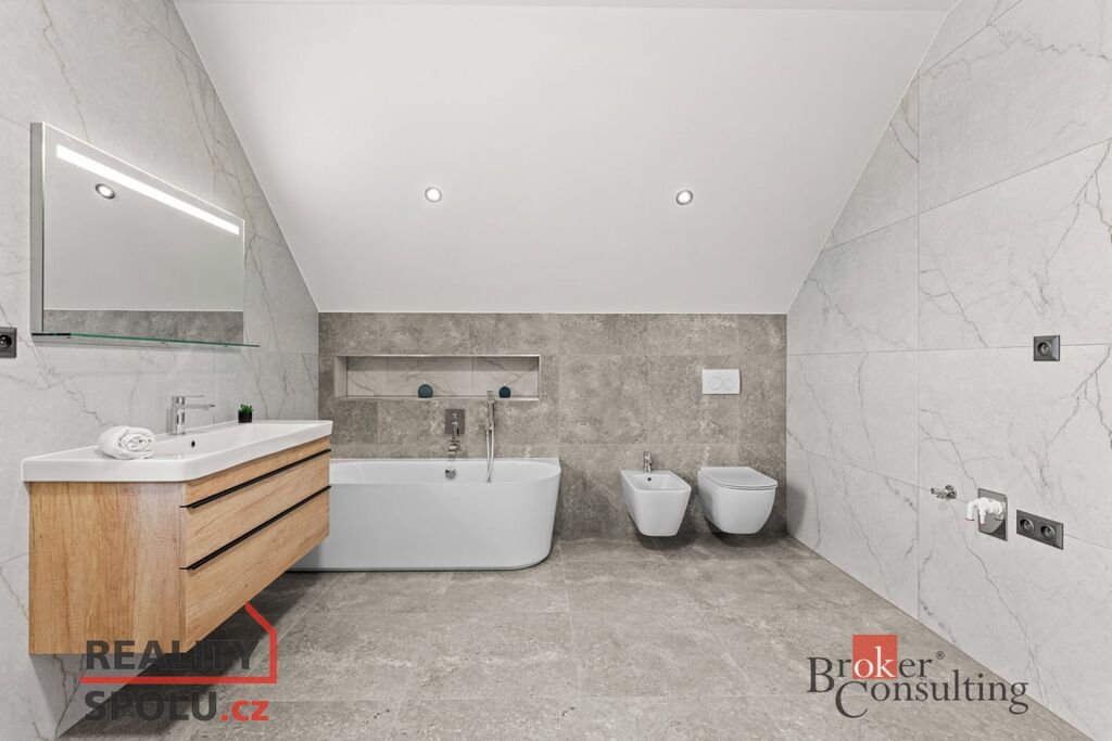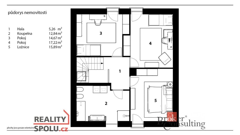 = 3x pokoj, chodba a schodiště, koupelna 12,84 m², půda k dalšímu využití