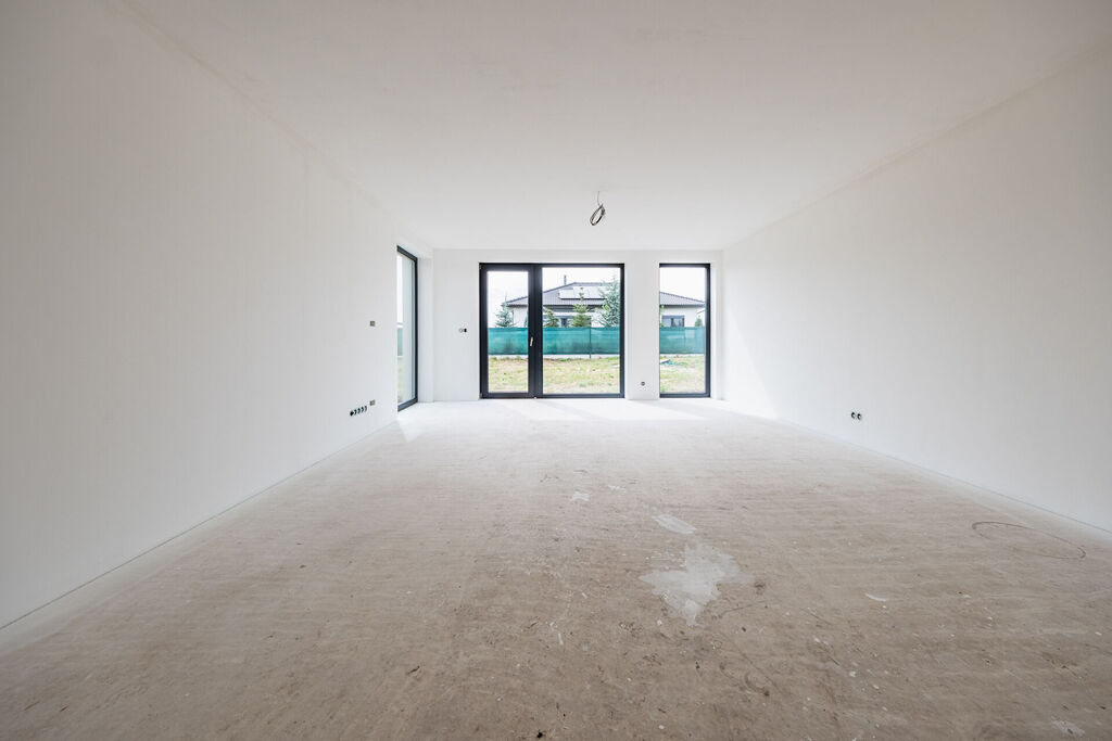Uvnitř domu vás přivítá otevřený obývací prostor s kuchyňským koutem, jehož velká okna propouštějí dostatek denního světla a propojují interiér s terasou a zahradou – ideálním místem pro relaxaci, dětské hry nebo letní grilování. Kuchyňský kout je připraven pro realizaci vaší vysněné kuchyně na míru.