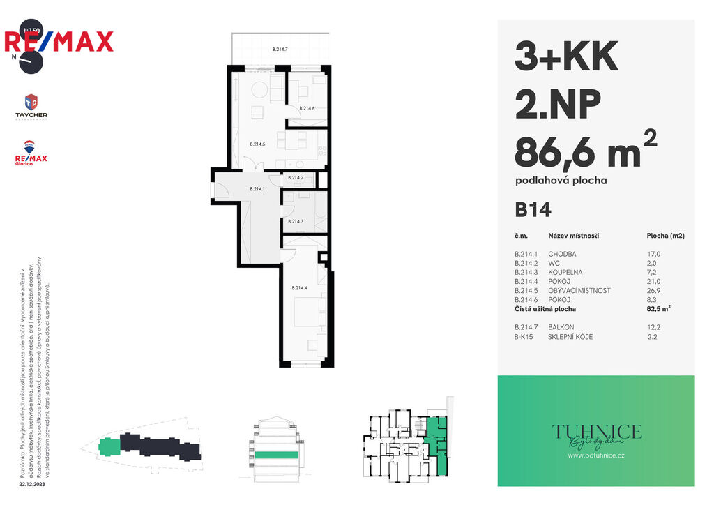 Nabízíme byt 3+KK o celkové ploše 86,16 + 12,19 m²(balkon), který se nachází ve 2.NP. Byt disponuje velkou vstupní chodbou s možností umístění vestavných skříní. Stejně jako v ostatních bytech je WC odděleno od koupelny. Přímo z obytné místnosti o velikosti 26,88 m² je vstup do malého pokoje o rozměrech 8,34 m², který je ideální použít jako pracovnu. V přiloženém půdorysu máte možnost si prohlédnout dispozici bytu, která odpovídá všem moderním standardům. Byt bude standardně vybaven dřevěnou podlahou a v koupelně a WC velkoformátovou moderní dlažbou. Finální materiály je možno samozřejmě s developerem individuálně řešit.