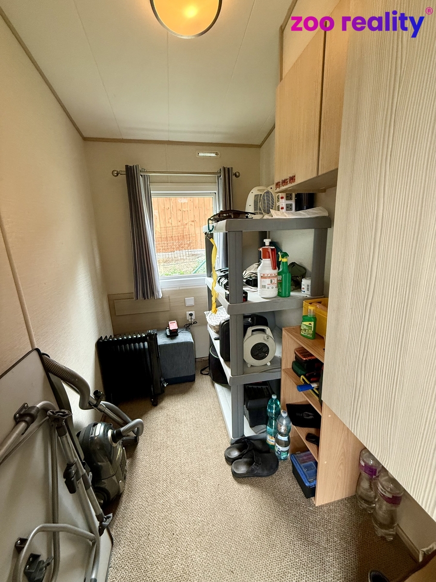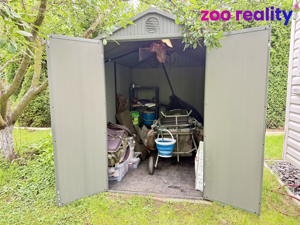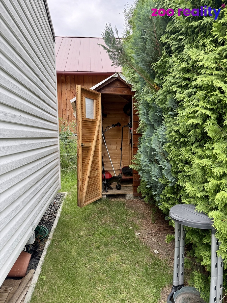 Na pozemku je zahradní domek a malá dřevěná skříň na nářadí. Parkování pro dvě auta.