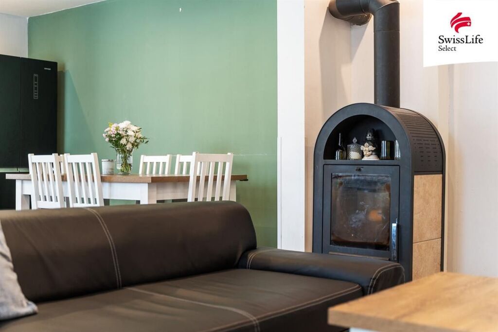 V přízemí vás přivítá prostorný obývací pokoj s krbovými kamny a kuchyní s ostrůvkem, která je srdcem domu.
