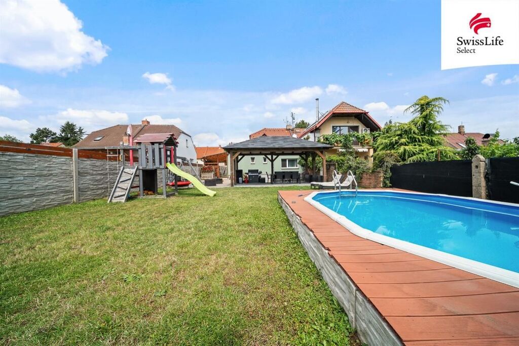 Zahrada je soukromá a připravená k životu zastřešená terasa s posezením a grilem, bazén, dětské hřiště a zahradní domek.