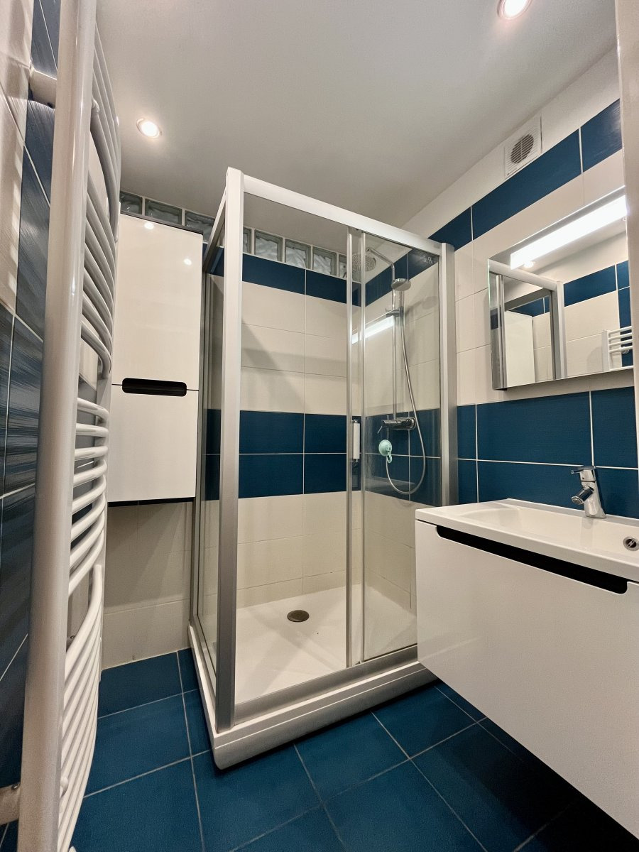 Zděná koupelna se sprchovým koutem a žebřinovým topením