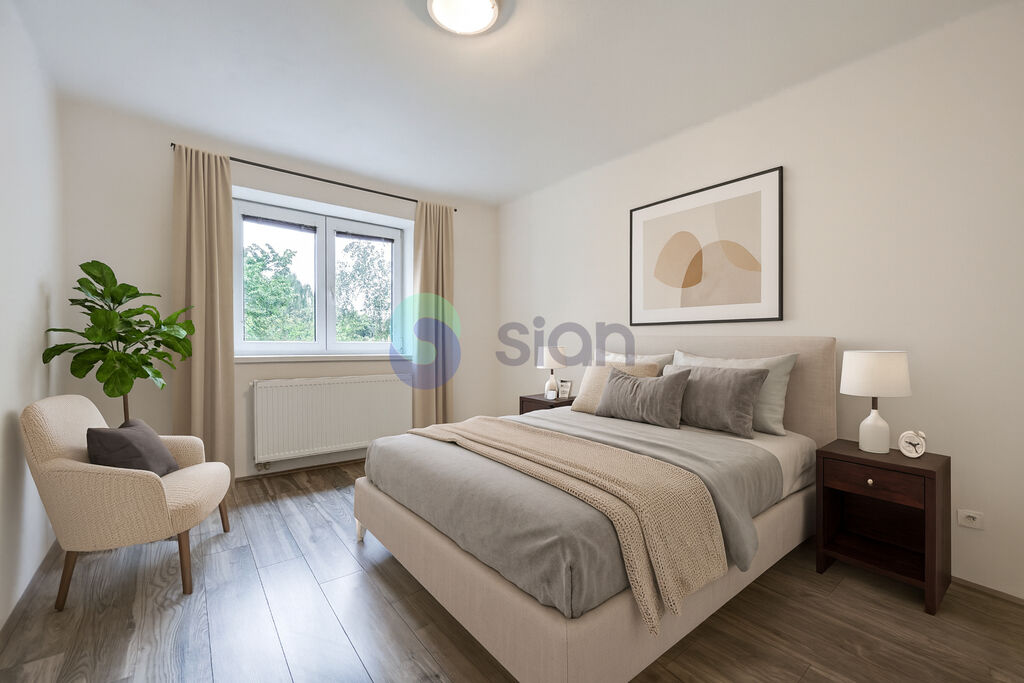 Dispozice bytu: prostorná kuchyně je propojena širokým průchodem s obývacím pokojem, odkud francouzské okno vede přímo na lodžii. Druhý pokoj – ložnice – je neprůchozí. Koupelna je vybavena vanou, toaletou, topným žebříkem a plynovým kotlem, nechybí ani příprava na pračku. Mezi fotografiemi najdete i vizualizace, pro představu zařízeného bytu.