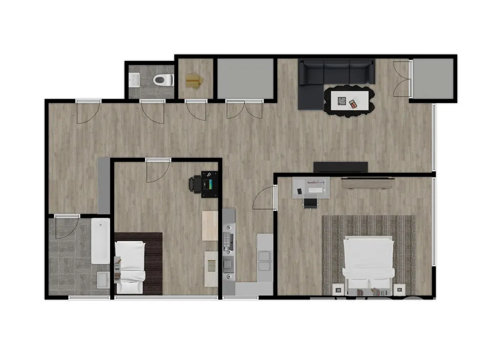 Byt se nachází ve 2.NP cihlového domu bez výtahu. Náleží k němu zděný sklep o velikosti 12m2. Samotný byt má dvě ložnice 23m2 a 14,5m2, velkorysý obývací prostor se vstupem na balkón a lodžii dále navazuje na kuchyni. V bytě pak nalezneme samostatnou toaletu a koupelnu s vanou. V chodbě u vstupu je prostorná vestavěná skříň.