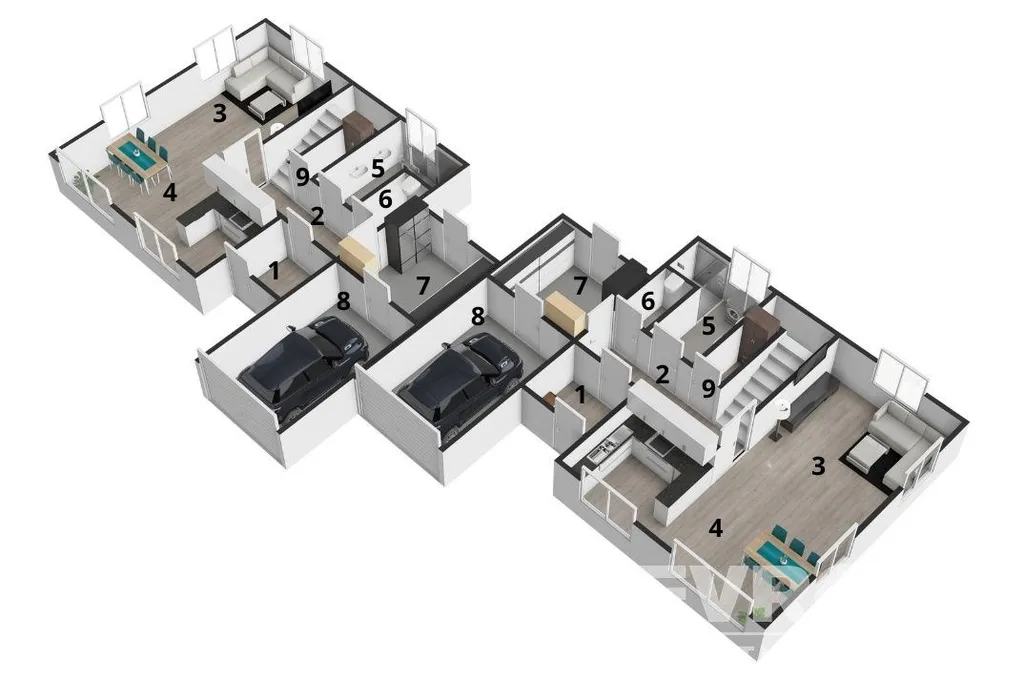 1.NP – obývací pokoj s kuchyní, spíž, koupelna, samostatné WC, technická místnost, předsíň, garáž se vstupem do domu.