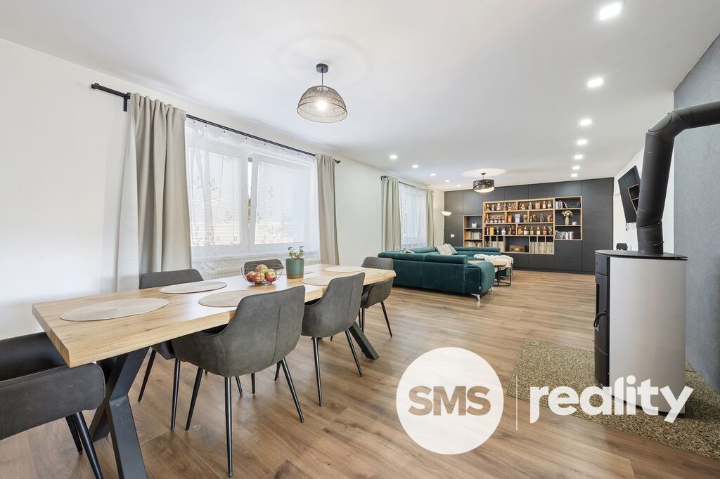 Obývací pokoj: prostorný, světlý, s krbovými kamny, které dodávají interiéru příjemnou atmosféru. Součástí je nadstandardní vestavná knihovna a pohodlný designový gauč.