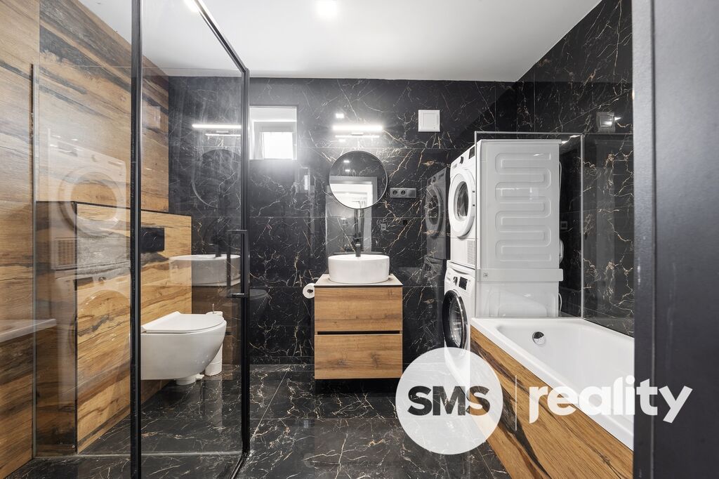 Koupelna: elegantní a nadčasová, vybavená sprchovým koutem, vanou a podlahovým vytápěním pro maximální komfort.