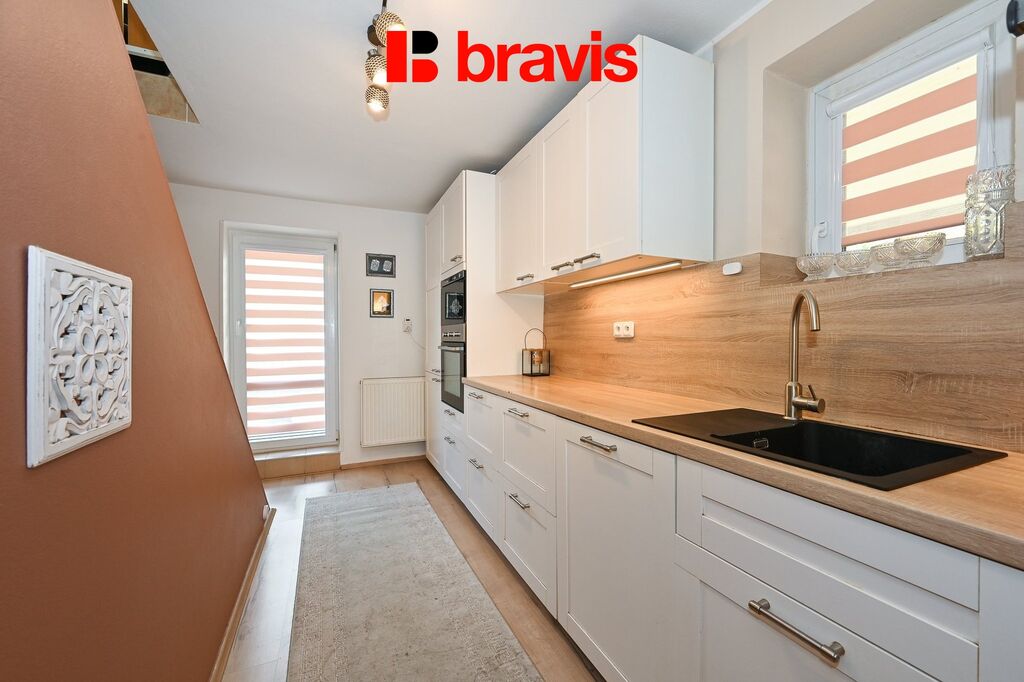 Mezonetový byt s krbem nabízí v přízemí prostornou předsíň, obytnou zónu s kuchyňským koutem, vstupem na terasu, koupelnu a šatnu. V patře se nachází otevřený podkrovní prostor s pracovním koutem a krbem, dětský pokoj a ložnice. Byt má přístup do vlastního sklepa a je vytápěn samostatným plynovým kotlem.