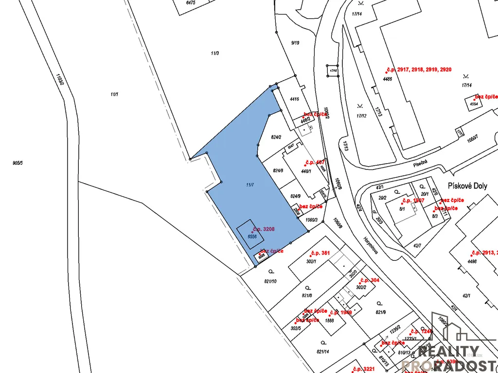 Jedná se o parcelu č. 11/7 (1 938 m²) + st. parcela č. 6556 (98 m²) se stavbou č.p. 3208 (výroba).