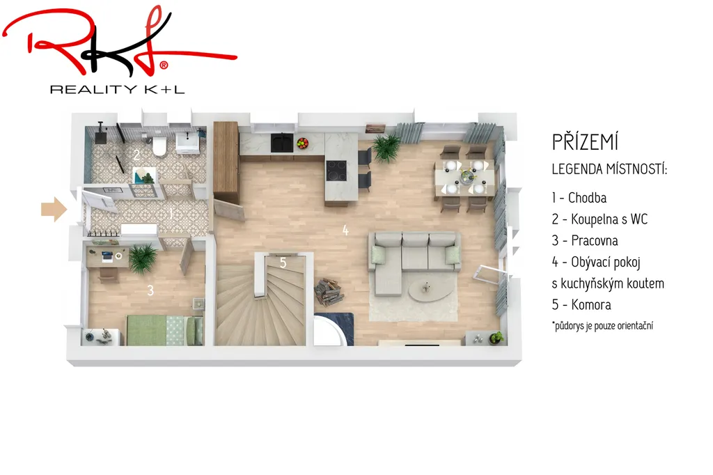 • prostorný obývací pokoj s kuchyňským koutem a vstupem na zahradu