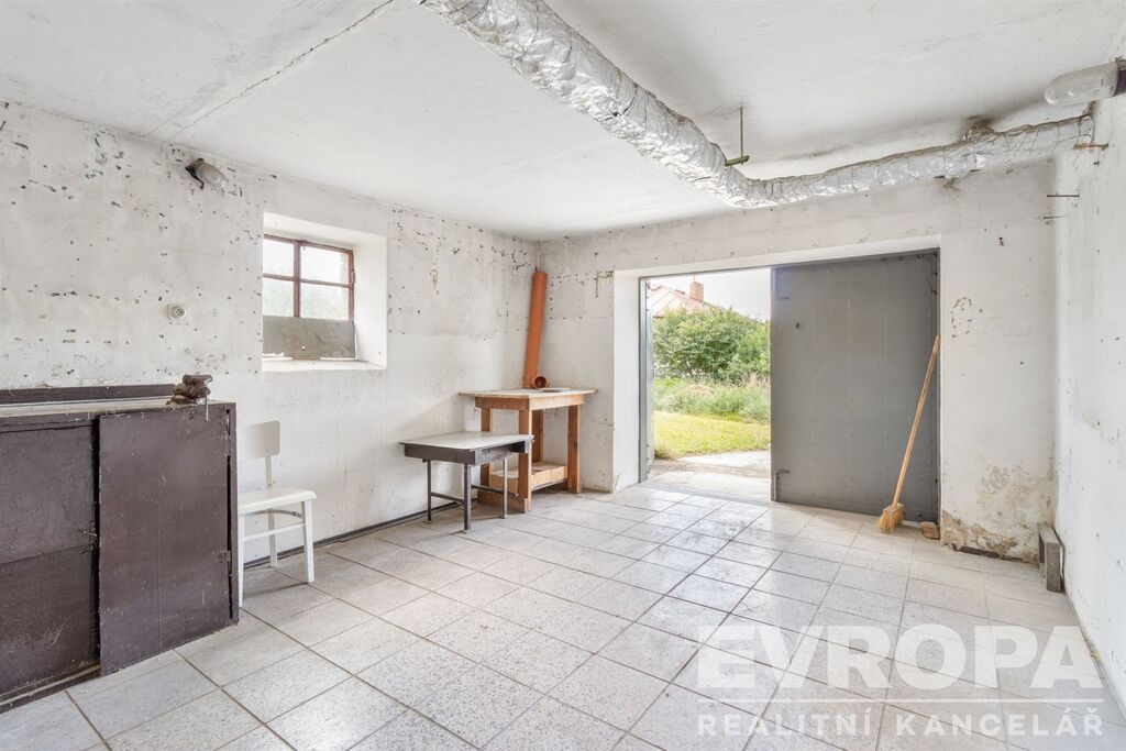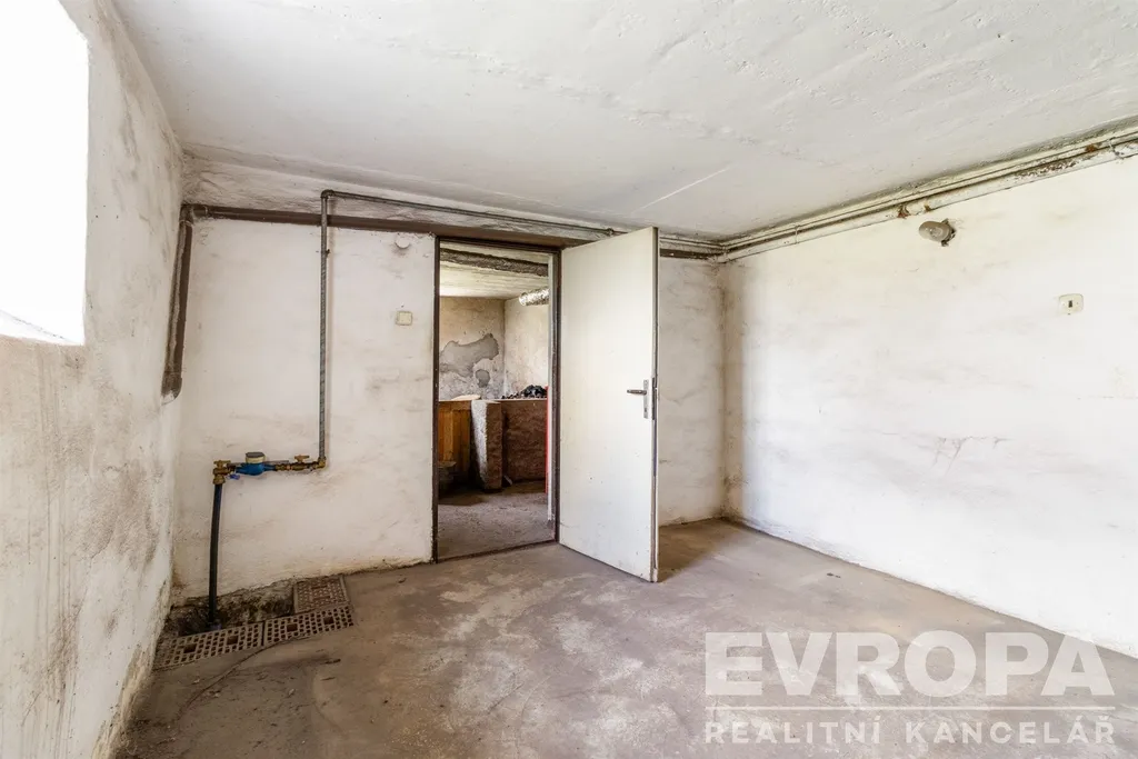 Garáž, technické zázemí domu včetně kotelny s kotlem na tuhá paliva a další úložné prostory.