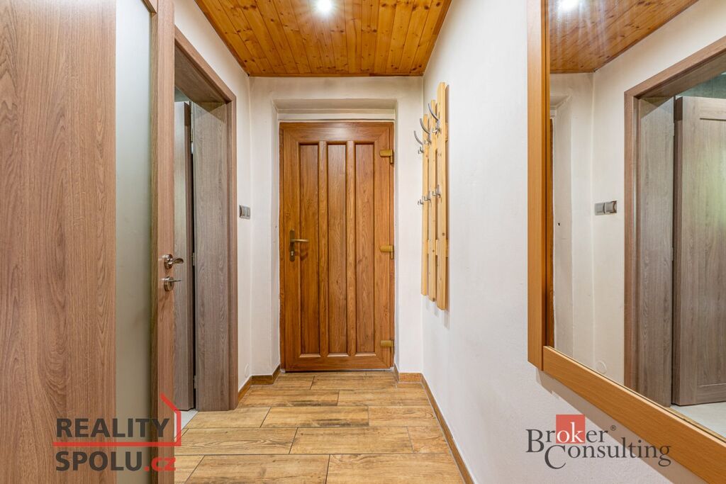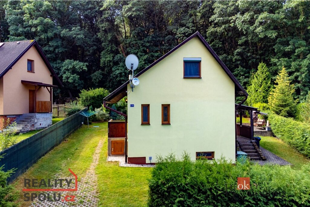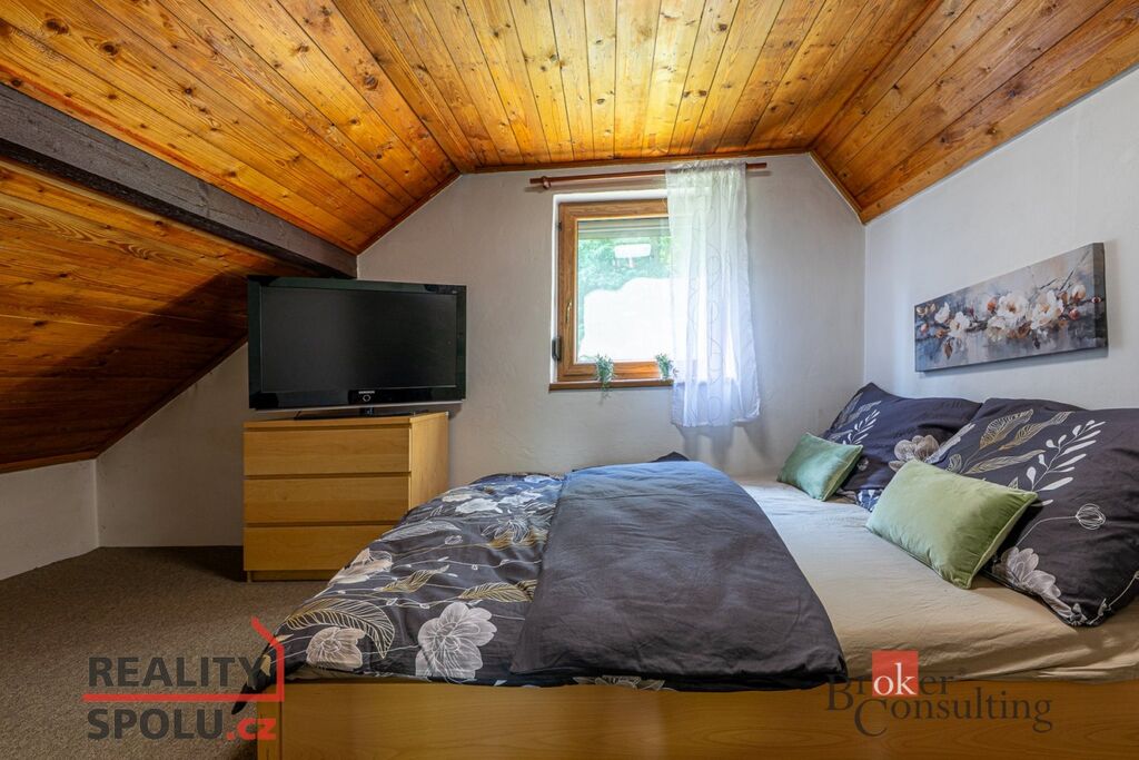 V přízemí najdete obývací pokoj s krbovými kamny, kuchyň a koupelnu se sprchovým koutem. V horním patře se nachází ložnice a další pokoj. Prostor je prakticky rozvržený a ideální pro víkendové pobyty i celoroční užívání.