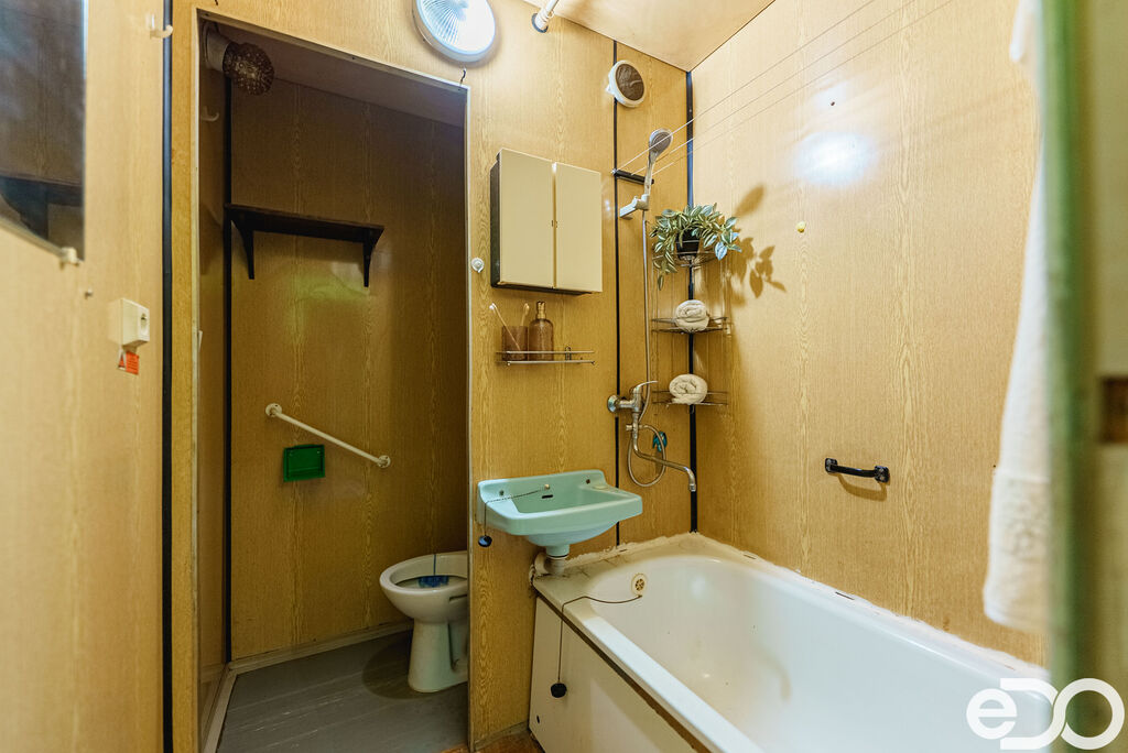 Ložnice pohodlně pojme manželskou postel i úložné prostory. Koupelna s vanou je průchozí na toaletu, což nabízí příležitost pro moderní dispoziční úpravy.