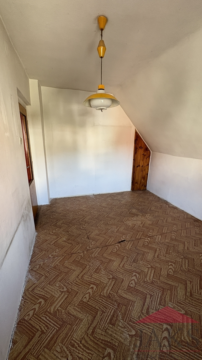 Popis: část. podsklepeno: sklípek pod shodami; 1.NP: vstupní chodba (schodiště do sklepa a do podkroví; kotel na T.P.), sam. WC, koupelna (vana, umyvadlo, el. boiler), kuchyň (kuch. linka s el. troubou se sklo.ker. deskou, digestoř) s jídelnou, obývací pokoj (krbová kamna); podkroví: podesta, 2x ložnice a půdička.