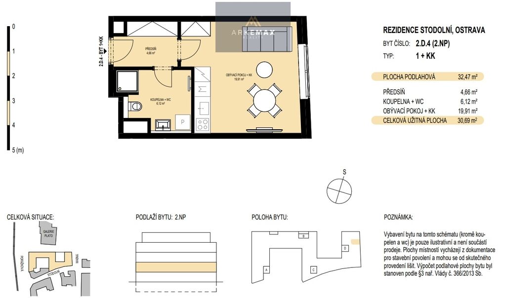 Jednotka je vedena jako byt (1+kk) o předpokládané podlahové ploše 32,47 m² a nachází se ve 2. nadzemním podlaží.