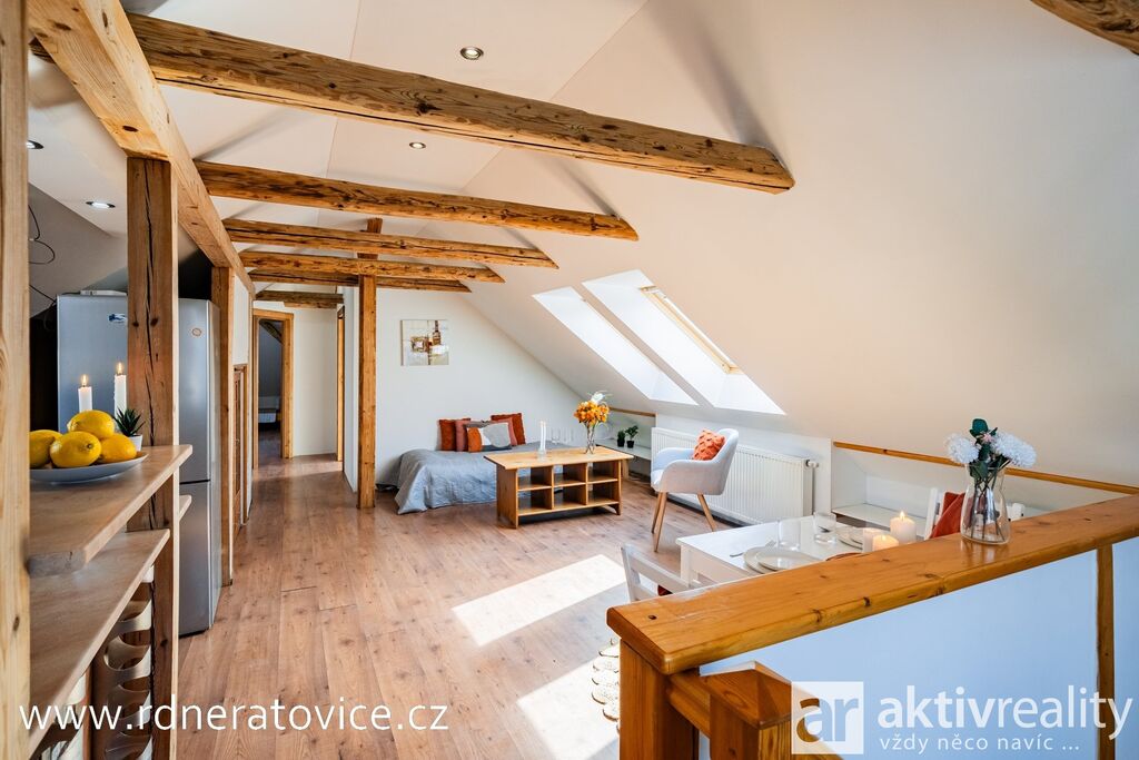 Do podkroví vejdete přes vstupní chodbu po schodišti s dřevěnými stupnicemi. Dispozice nabízí obývací pokoj s jídelnou a kuchyní na míru (myčka Bosch, sklokeramická deska Fagor), ložnici, dětský pokoj, pracovnu, technickou místnost a koupelnu s vanou, WC, přípojkou na pračku a vstupem na balkon. Byt má vlastní měřiče vody, elektřiny i plynu. Vytápění a ohřev vody zajišťuje plynový kotel.