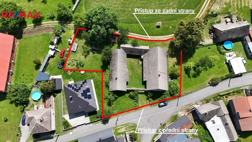 Pozemek je přístupný z obecních cest z přední i zadní strany. Uzavřený dvůr zajišťuje naprosté soukromí a nabízí široké možnosti využití – pro rodinné bydlení, rekreaci, drobné podnikání nebo jako investiční příležitost.