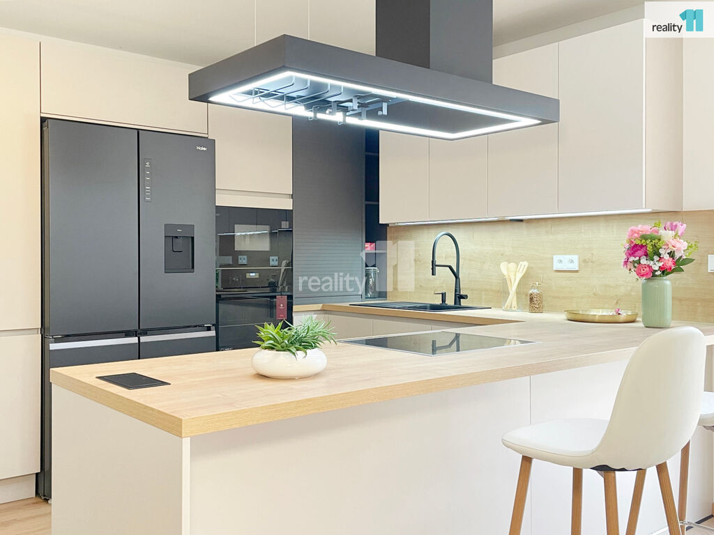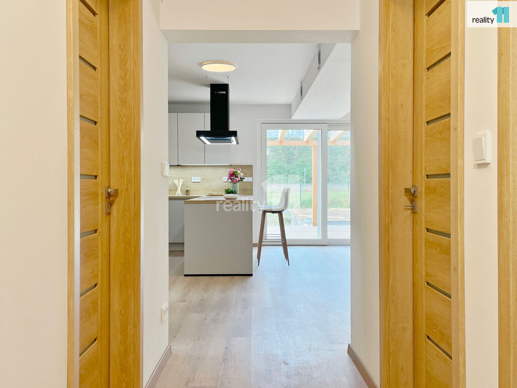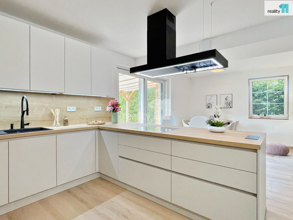Již při vstupu Vás okamžitě zaujme prostorné, slunné zádveří a otevřený koncept obývacího pokoje propojeného s na míru realizovanou kuchyní. Kuchyňská linka je vybavena všemi moderními spotřebiči – indukční varnou deskou, zabudovanou troubou, mikrovlnkou, myčkou, prostornou lednicí s mrazákem – a nechybí ani stylový kuchyňský ostrůvek, kolem kterého se bude odehrávat život celé rodiny. Světlá podlaha a velká okna vnášejí do domu radostnou atmosféru a propojují interiér se zelení za okny.