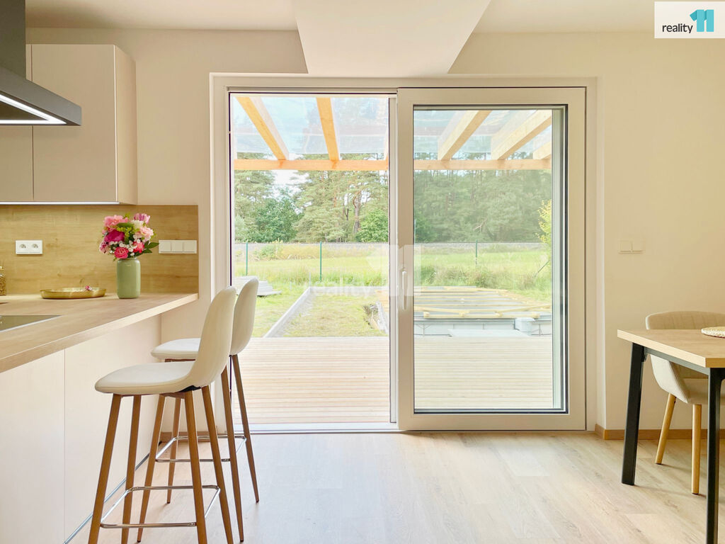 Obývací prostor přímo navazuje na terasu o velikosti 18 m² s dřevěnou pergolou, ideální pro společné snídaně i letní grilování. Na zahradě, která nabízí dostatek místa pro dětské hry, stojí také venkovní zastřešený bazén, který zajistí spoustu letních zážitků bez nutnosti opouštět pohodlí domova. Celková plocha pozemku činí 1 000 m², což vám dopřeje dostatek soukromí i prostoru pro malé dobrodružství vašich dětí.