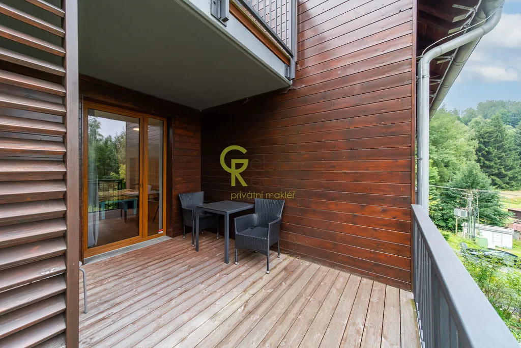Novostavba, včetně vybavení, parkingu, terasy a sklepa. Připravili jsme pro Vás výhradní prodejní nabídku krásného, plně vybaveného horského apartmánu 1+kk o velikosti 36,9 m² + terasa 11 m² v malebné obci Bratrouchov, ležící v západní části Krkonošského národního parku. Apartmán se nachází v bytovém domě z roku 2021, který je součástí exkluzivního komplexu tří budov propojených podzemními tunely. Interiér apartmánu je navržen s důrazem na kvalitu a komfort. Vstupní chodba nabízí praktické úložné prostory na obuv a oblečení. Moderní kuchyňský kout je plně vybaven vestavěnými spotřebiči a plynule navazuje na obývací část s rozkládací sedací soupravou a skříněmi. Koupelna je zařízena sprchovým koutem a sanitou značky Laufen, WC je součástí koupelny. V celém apartmánu byly použity kvalitní materiály, jako jsou dřevěné podlahy, masivní dveře a stylová skandinávská svítidla, které dodávají prostoru příjemnou atmosféru. K apartmánu náleží prostorná terasa 11 m² s výhledem, sklep o velikosti 4,4 m² vhodný pro uložení kol či lyží a vyhrazené parkovací místo přímo u domu. Celý komplex je vybaven moderními technologiemi, včetně vlastního systému úpravy vody, filtrace odpadních vod, trafostanice a kamerového systému. Samozřejmostí je vysokorychlostní internet dostupný jak v apartmánech, tak ve společných prostorách. Díky recepci v objektu, key boxu, možnosti zajištění úklidu a dálkovému ovládání topení je apartmán vhodný nejen pro vlastní rekreaci, ale i jako investice k pronájmu s minimálními starostmi. Bratrouchov se nachází jen 15 minut od Rokytnice nad Jizerou a 20 minut od Harrachova. Přímo v místě jsou upravované běžkařské stopy a mimo zimní sezónu okolí nabízí množství cyklistických a turistických tras vedoucích například na Dvoračky, Rezek, Horní Mísečky či Zlaté návrší. Tento apartmán tak představuje ideální spojení komfortního zázemí, moderního vybavení a atraktivní horské lokality, která potěší jak milovníky aktivní dovolené, tak ty, kteří hledají klidné místo k odpočinku. Pro více informací nebo prohlídku nás kontaktujte, rádi se Vám budeme věnovat. (PENB - C)