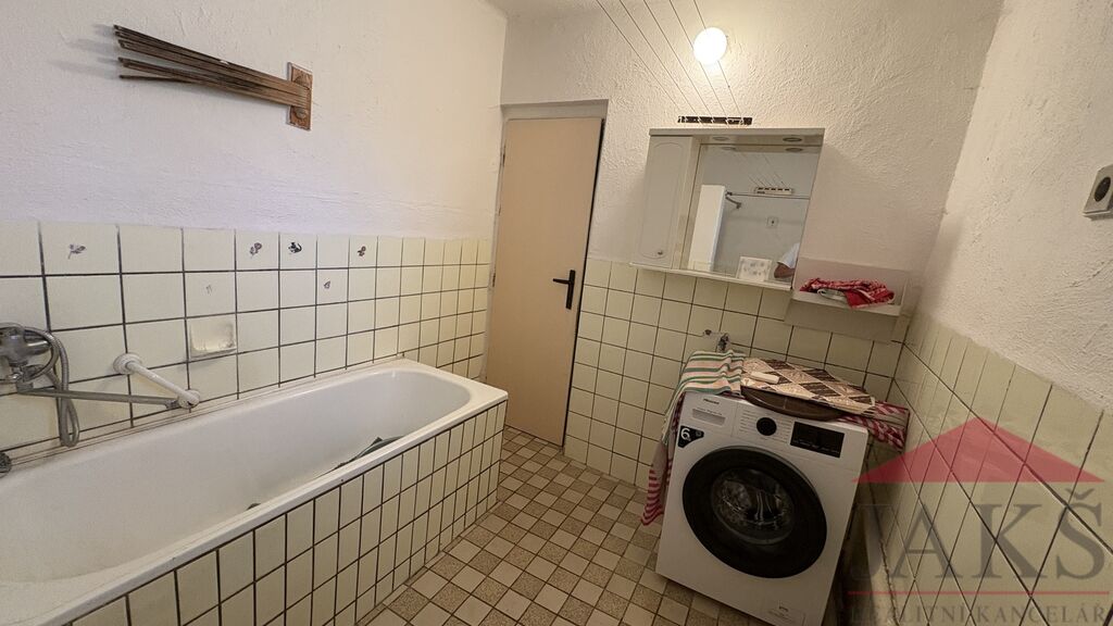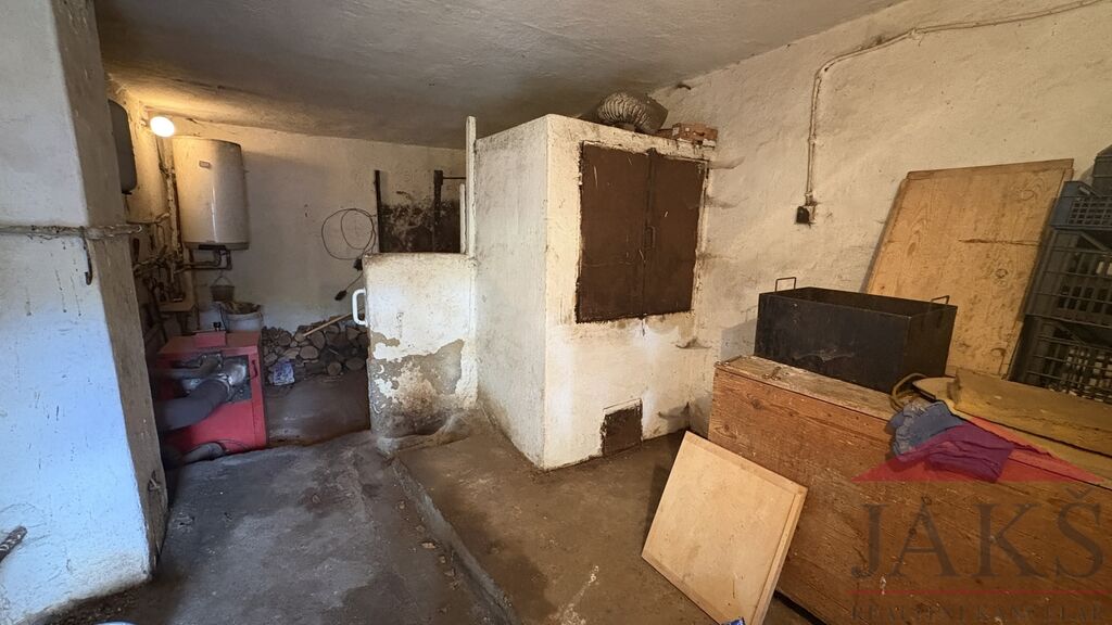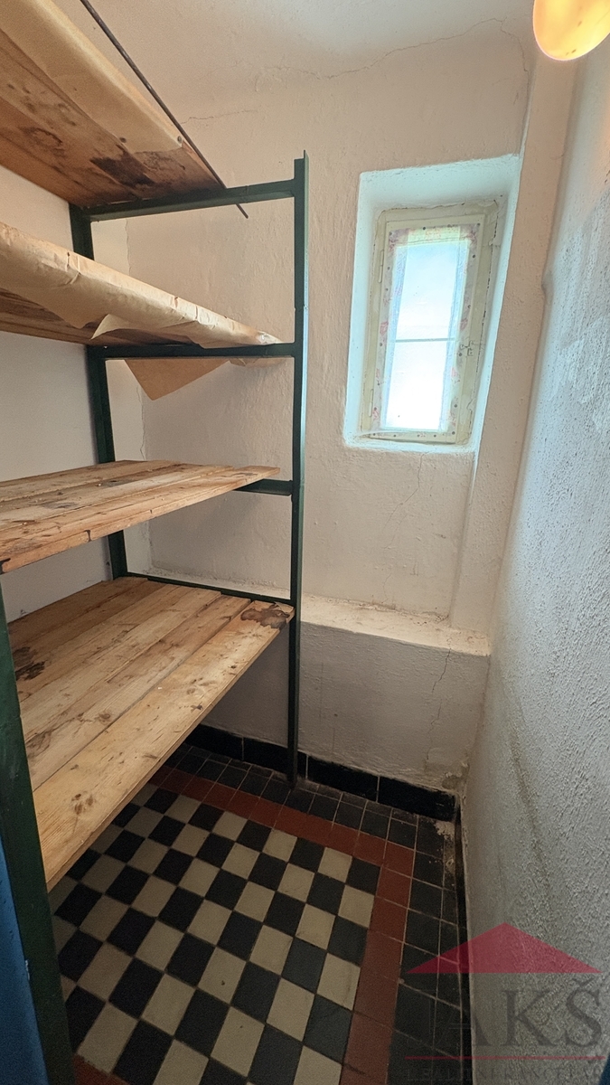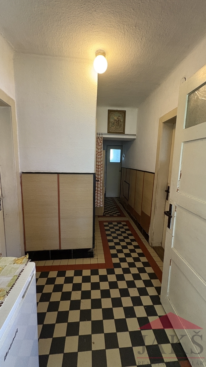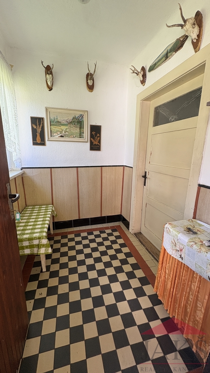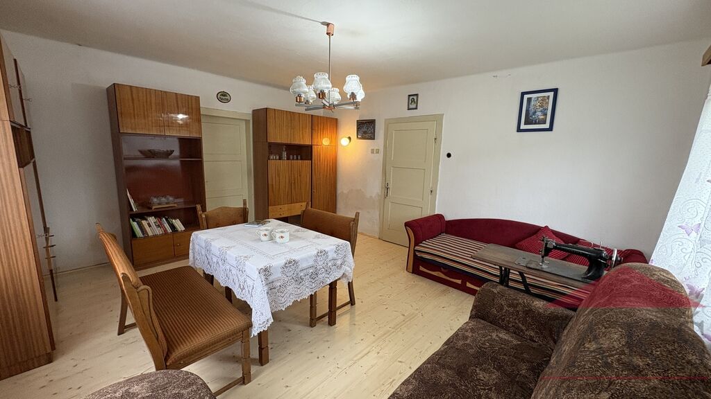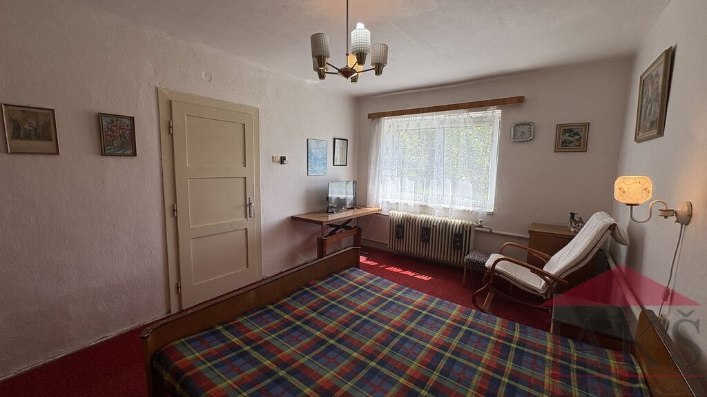 Popis: přízemí: venkovní zastřešená veranda, vstupní veranda, chodba, komora, koupelna (vana, WC, vývody na pračku) s oknem, kuchyň (kuch. linka s dřezem, el. sporák, umyv., el. sporák, sporák na T.P.) s jídelnou, obývací pokoj (nová dřevěná podlaha) a ložnice; půda.