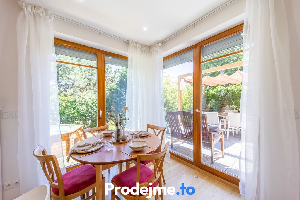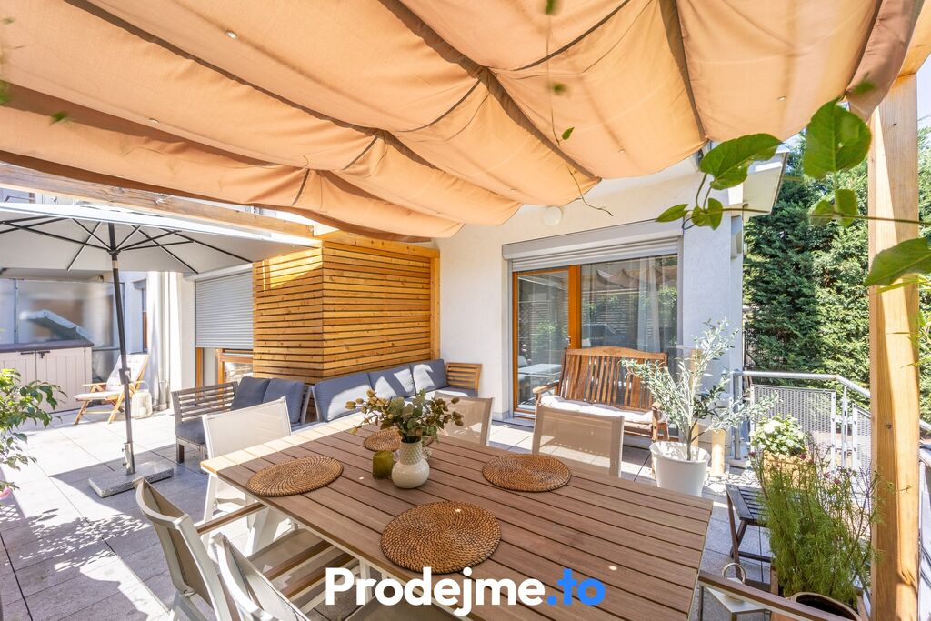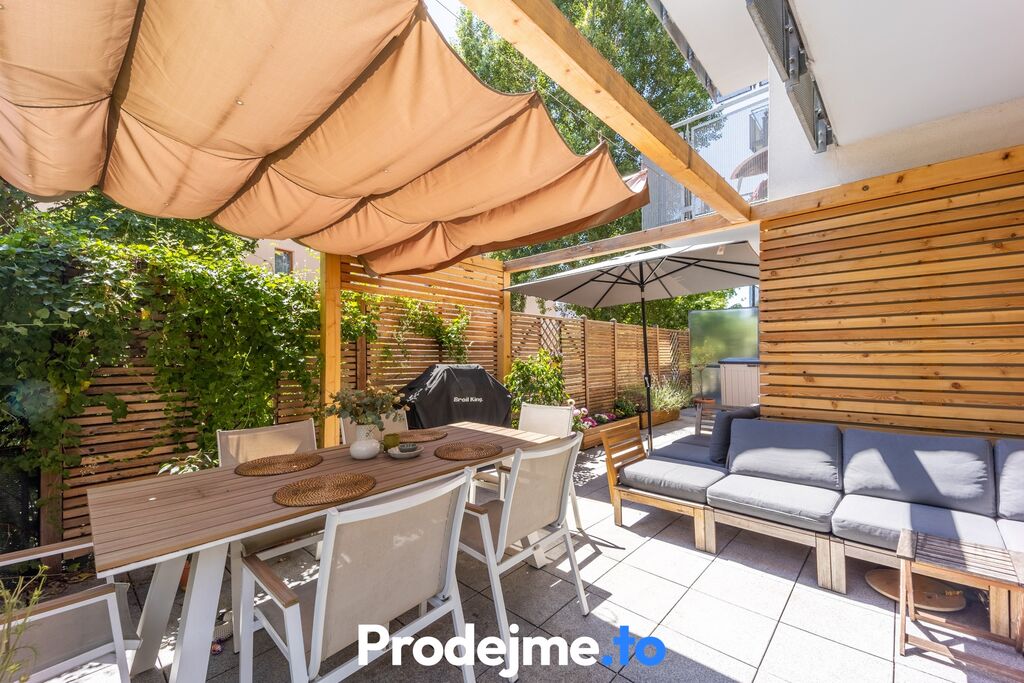 Tady si můžete užívat volný čas venku, aniž byste opustili domov. Terasa díky své velikosti 41,68 m2 nabídne místo pro zahradní posezení, gril i okrasné květiny. Dokonalost podtrhuje dřevěná pergola s látkovou markýzou a vstup na vlastní předzahrádku. Ta má 65 m2, je oplocená a porostlá zelení poskytující soukromí. Příjemným bonusem je bazén s průměrem 2,9 m včetně filtrace a solinátoru.